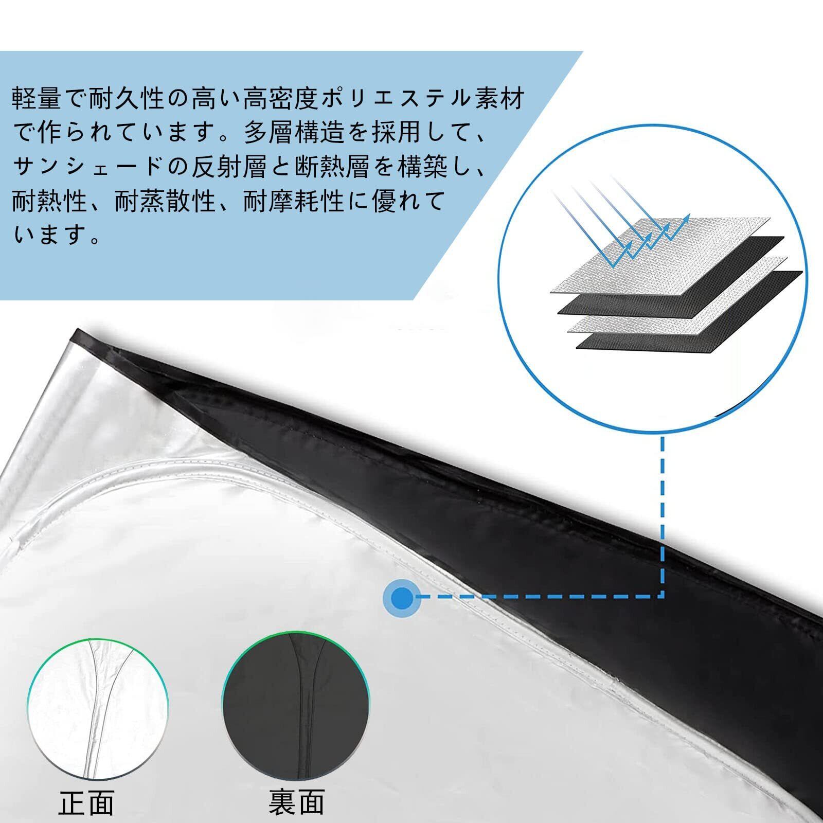 ①素材:軽量で耐久性の高い高密度ポリエステル素材で作られています。多層構造を採用して、サンシェードの反射層と断熱層を構築し、 耐熱性、耐蒸散性、耐摩耗性に優れています。軽量なので、コンパクトに収納できます。 大きなサイズでも持ち運びや設置が簡単です。