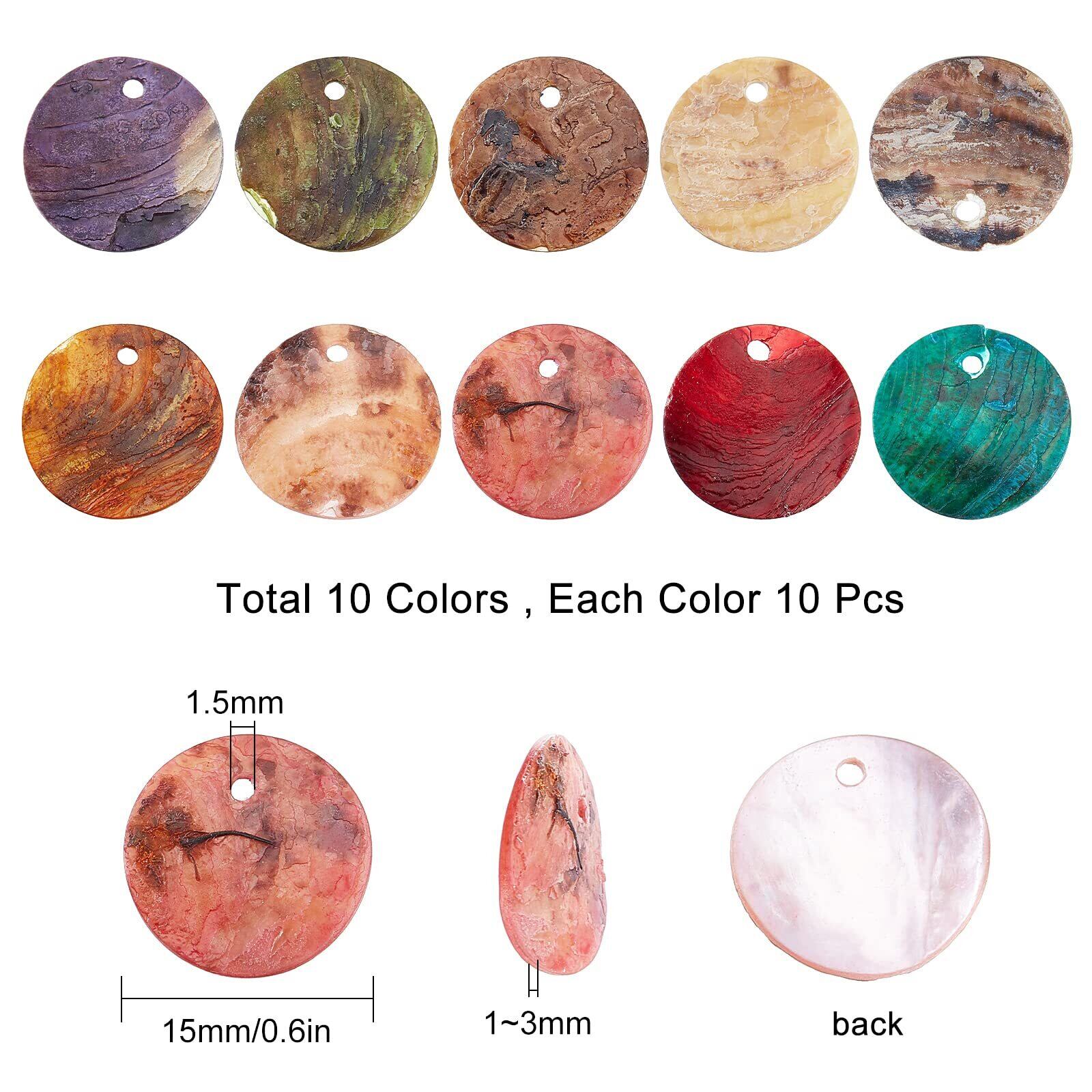 【100個10色貝殻チャーム】:貝殻チャームは紫色、緑色、コーヒー色、赤色など10種類天然石の色を選び、自然の柄を円形貝殻チャームに印刷し、各色の彩度が非常に高く、五色の夏にぴったりです。