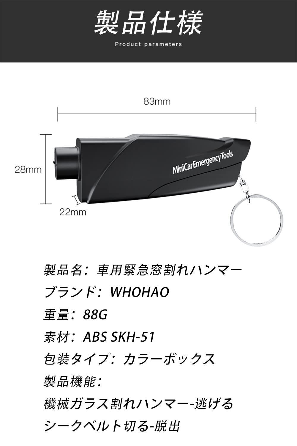 WHOHAO 多機能窓割れハンマー 緊急脱出用ハンマー 水中適用 安全ハンマー シートベルトカッター付き 自動車用 家用 合金ハンマーヘッド 1秒ガラスを割る 緊急ツール 軽量実用 便利 運びやすい 女性と年配の方でも使える テスト用ガラス付属 (黒 2 Pack)