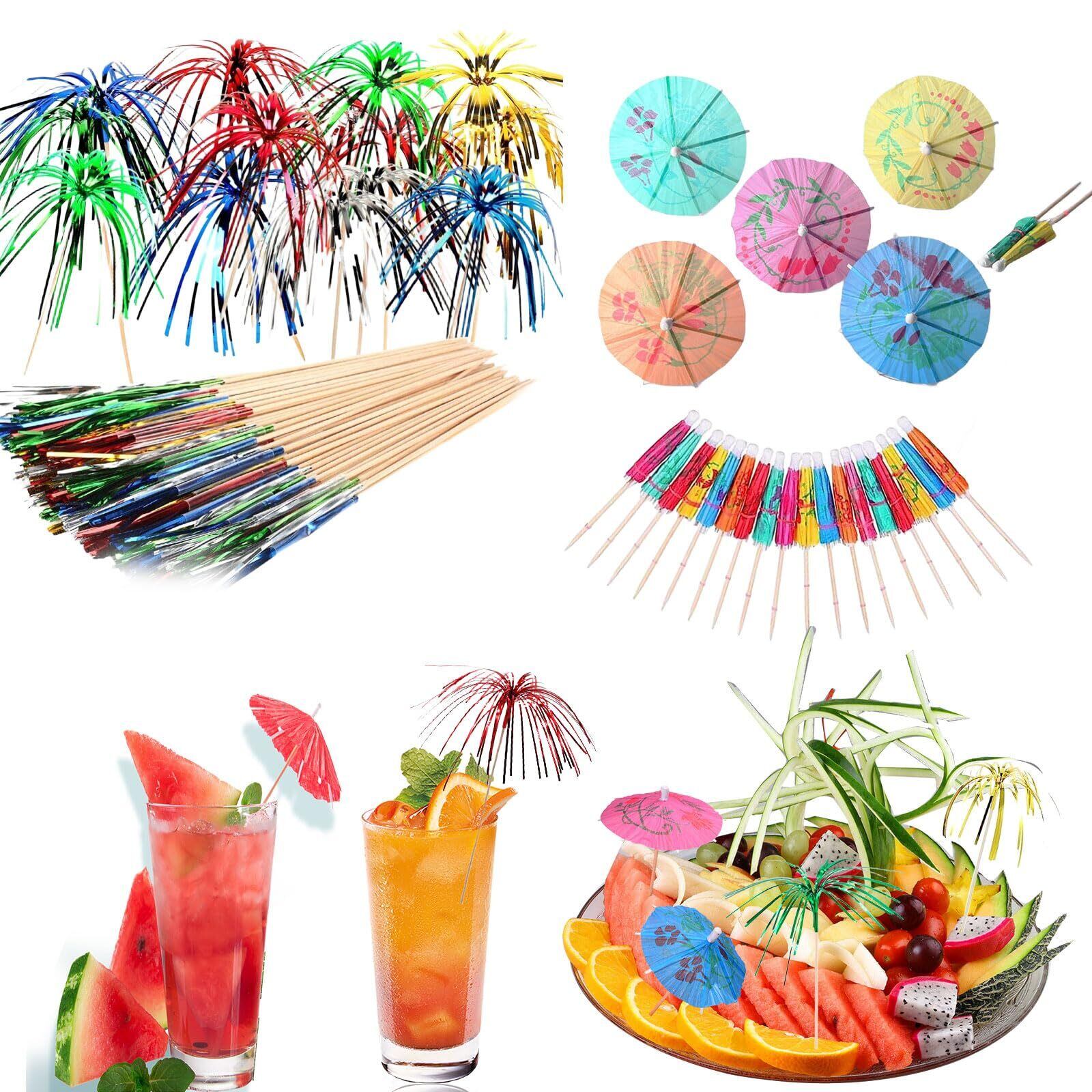 【デザイン】カクテルスティック花火と傘のデザイン、楽しくて実用的。 色鮮やかでキラキラと輝くカクテルつまようじは、ひと刺しするだけで彩りを添え、お料理やドリンクを華やかに演出します。 雰囲気を作り出し、たくさんの楽しみを加えます。