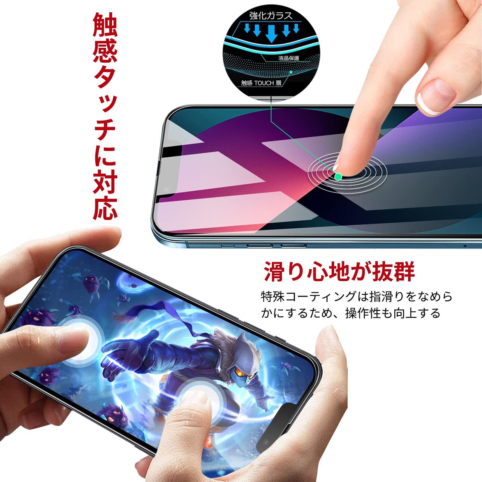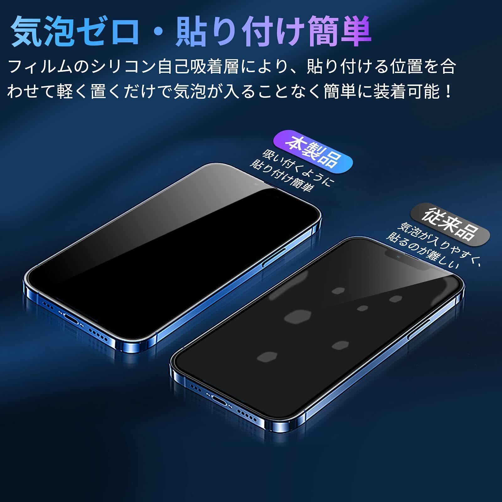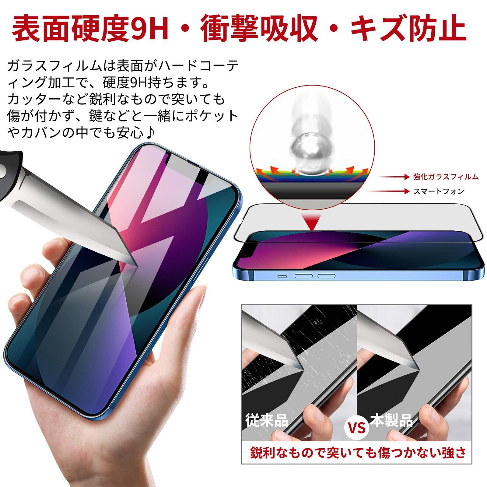 ✩表面硬度9H・傷がつきにくい:本製品はiPhone14・iPhone13・iPhone 13 Pro(アイフォン14・アイフォン13・アイフォン13 プロ)対応な液晶保護フィルムです。表面硬度9Hの強化ガラスを採用して、高い引っかき硬度を持つため、万が一鍵などと擦れてしまっても傷がつきにくく、きれいな状態を保ちます。特殊な飛散防止設計により、万一割れてしまった際にもガラス破片が飛び散らない、スクリーンをきちんと保護しながら破損による怪我も防ぎます。