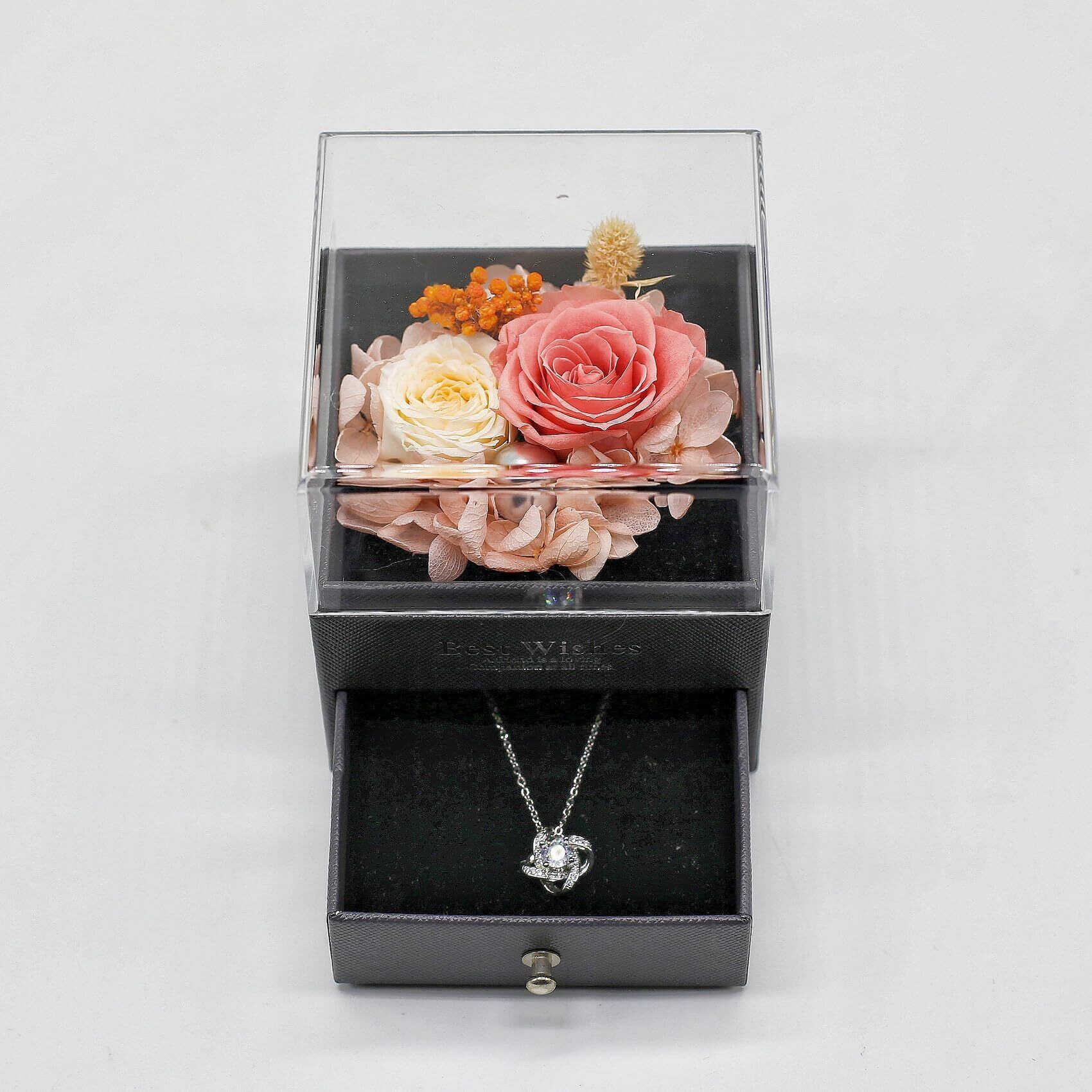 本物のバラのプリザーブドフラワーとネックレスは、お互いの愛を象徴しています。バラは情熱的でロマンチックな意味をします。永遠の愛、感謝また最高な願いの象徴です。プリザーブドフラワーは本物の花に比べて世話が必要なく、保存期間が長くで、ローズボックスに入れることで、透明な蓋を通って360度様々な方向から長時間鑑賞することができます。