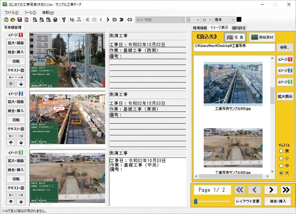 『はじめての工事写真作成5 Lite』はデジカメ等で撮影した工事の工程、進捗をまとめた写真帳作成ソフトです。