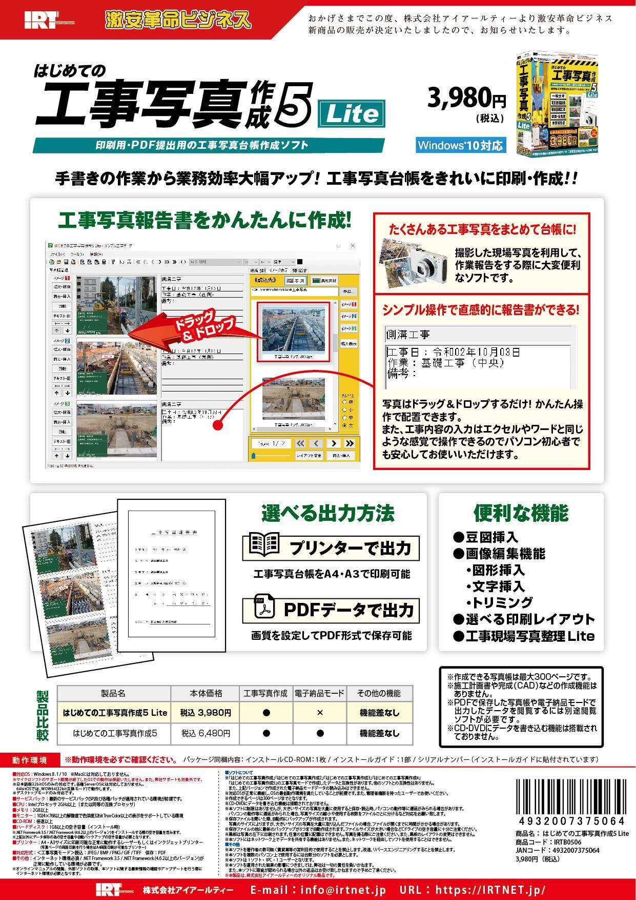 ※『はじめての工事写真作成5』の電子納品機能を省いた写真帳作成機能のみの廉価版ソフトです。