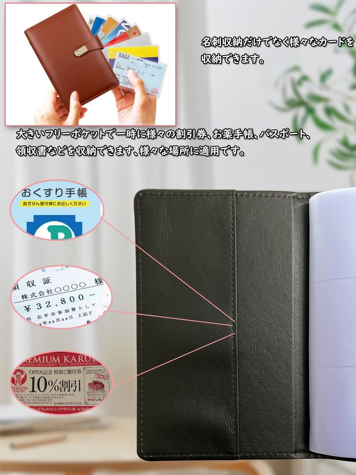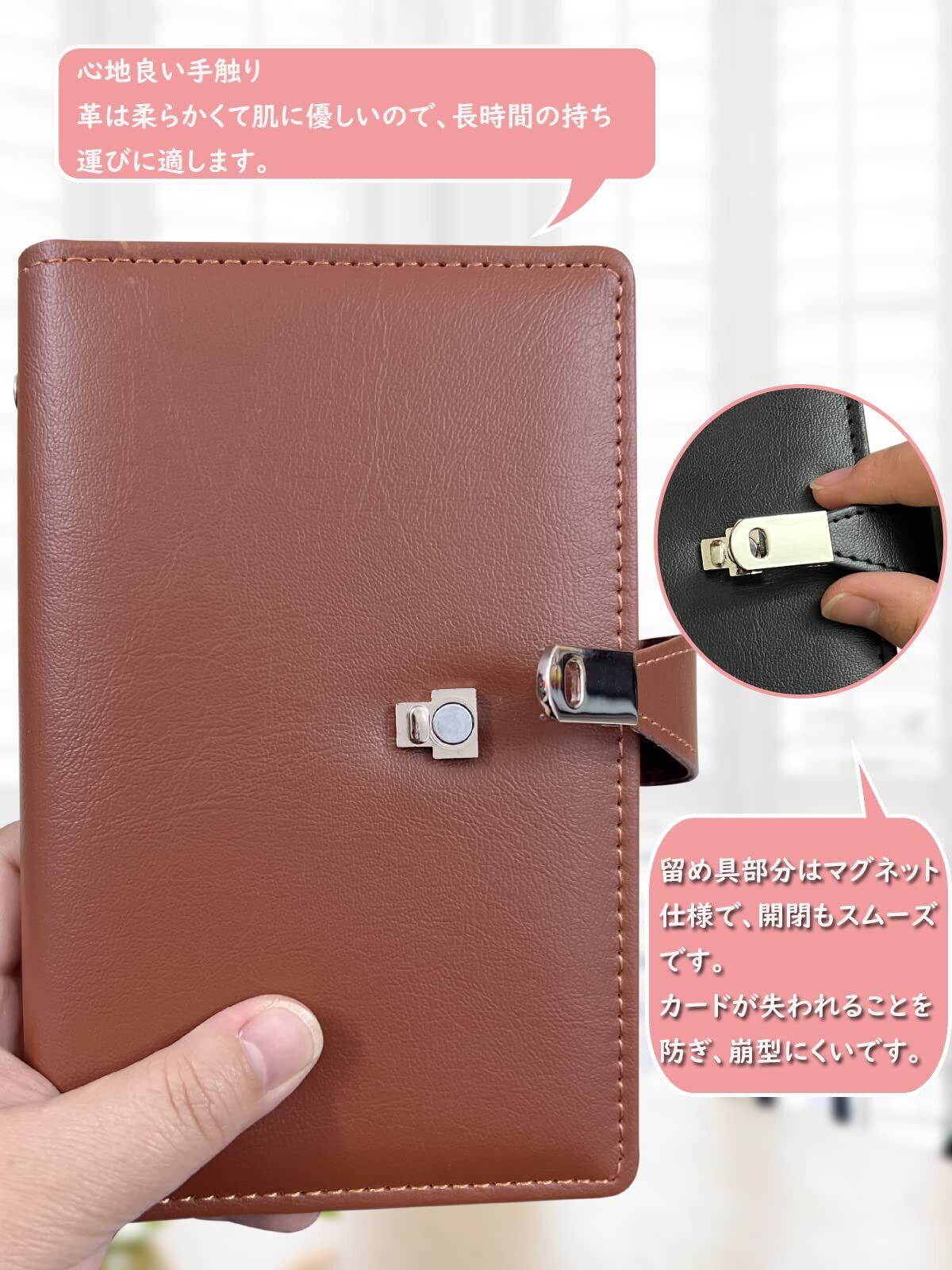 コンパクトで大容量 本体サイズ:約19.5×15×2.5cmのコンパクト設計、鞄に入れやすく、持ち運びやすいサイズで作業効率がアップです。 最大300枚収納可能 片面に3枚、見開き6枚を収納することができます。50ページで最大300枚の名刺が収納可能となっております。 高級感のある質感 までる本革にような高級PUレザーを贅沢に使用しています。質感は高級感があるのに、面倒なお手入れが不要なので、忙しいあなたにぴったりの名刺ホルダーです。 撥水性あ、安心 PUレザーの特徴として、しなやかな強さと肌のような質感があります。通気性があり撥水性も高いで四季のある日本の気候に適した素材です。 丈夫なPVCシート 名刺ホルダーは柔らかくてサラサラとしたPVCシートを使用。カードが引っ付いたりせず、出し入れがしやすくなっており、丈夫で長く使っていただくことができます。 取り出しやすくポケットサイズ ポケットのサイズを標準名刺サイズより、幅3ミリ短く、高さは3ミリ大きくすることで、さっと取り出しやすい収納ポケットを実現しました。 マグネット式のベルト付き 安心の開封防止マグネット式のベルトが付属しています。鞄の中や持ち歩く際に開いて中身が飛び出す心配がないので、安心して使用して頂けます。 便利な内ポケット付き 表紙の裏側にはポケットが付いています。自分の名刺や整理前の名刺、ちょっとしたメモなどを入れるのに便利。