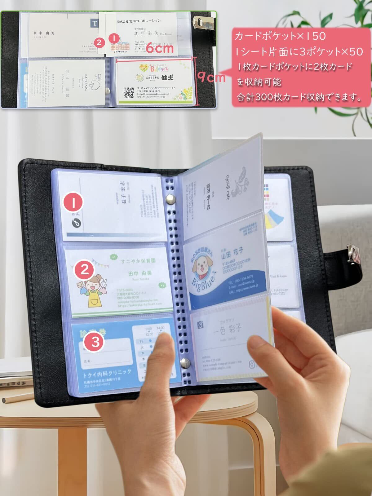 名刺ケースの表紙の裏側にポケットがあり便利です。サイズ:約19.5×15×2.5cm、ポケット数は3段×50枚の合計150ポケット。1ポケットに両面で2枚入れると、合計300人分収納可能です!