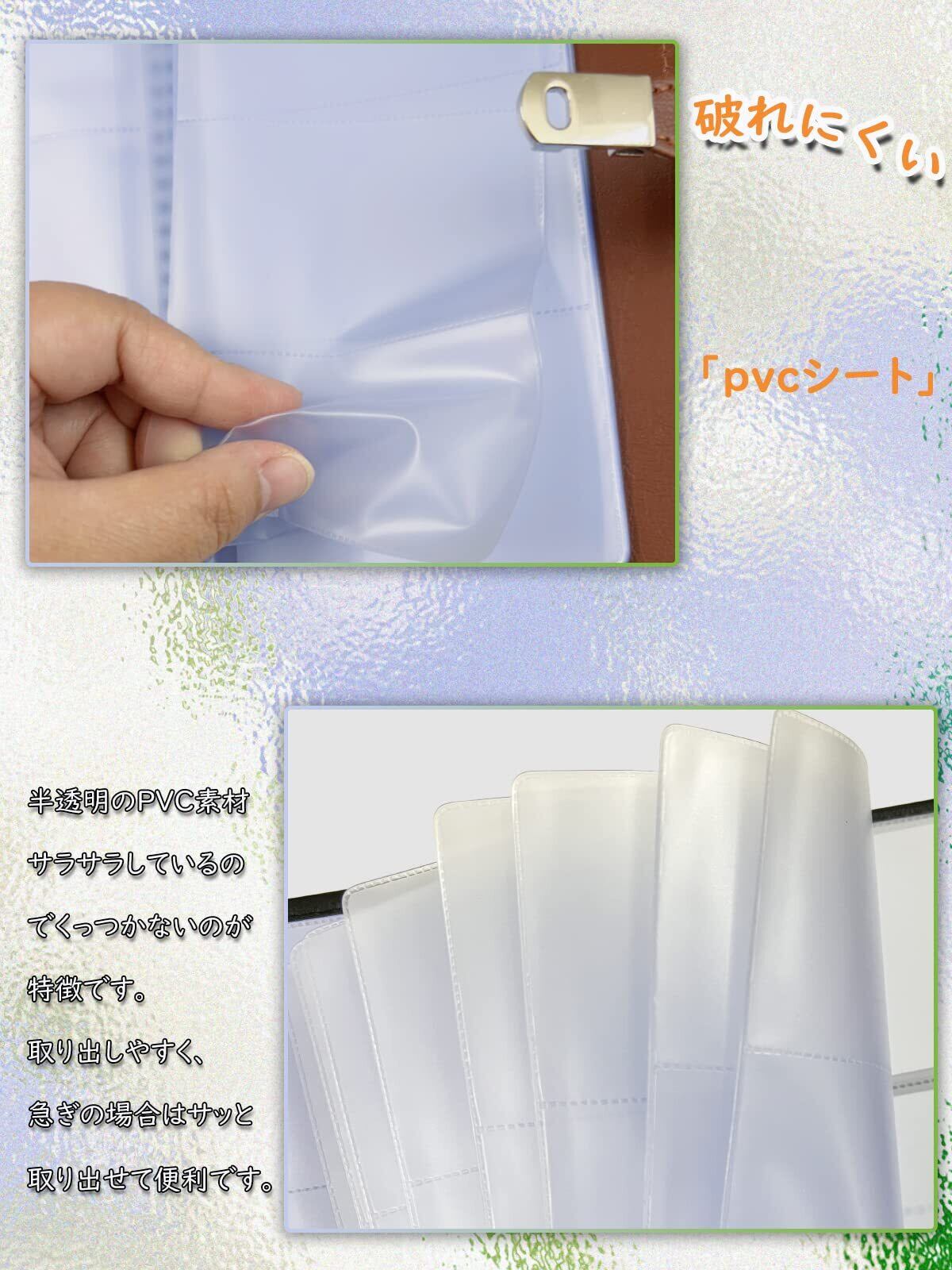 汚れに強い、レザー表面にフッ素処理がされていて汚れが付きにくく付着しても落とすのが簡単。半透明のPVC素材はサラサラしているのでくっつかないのが特徴。取り出しやすく、急ぎの場合はサッと取り出せて便利です。