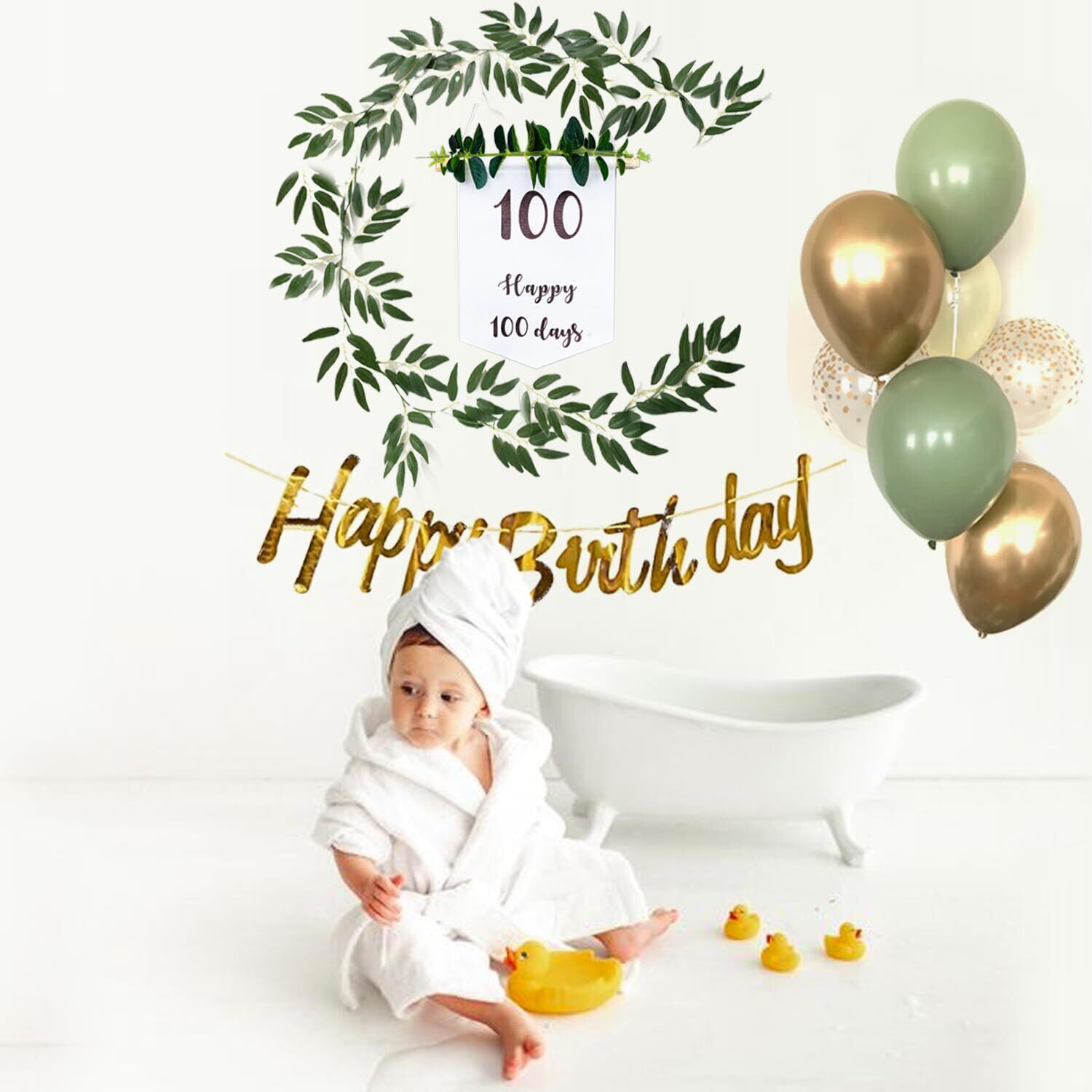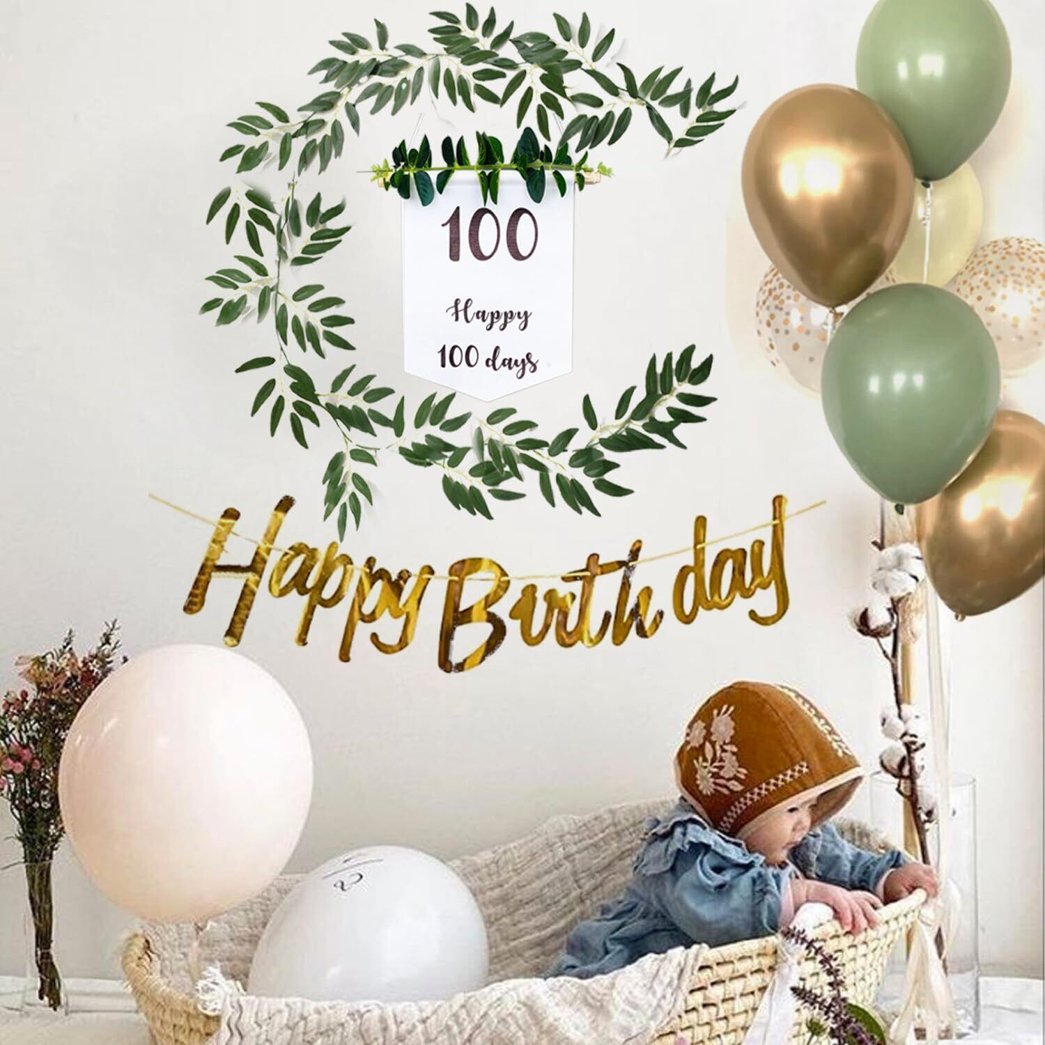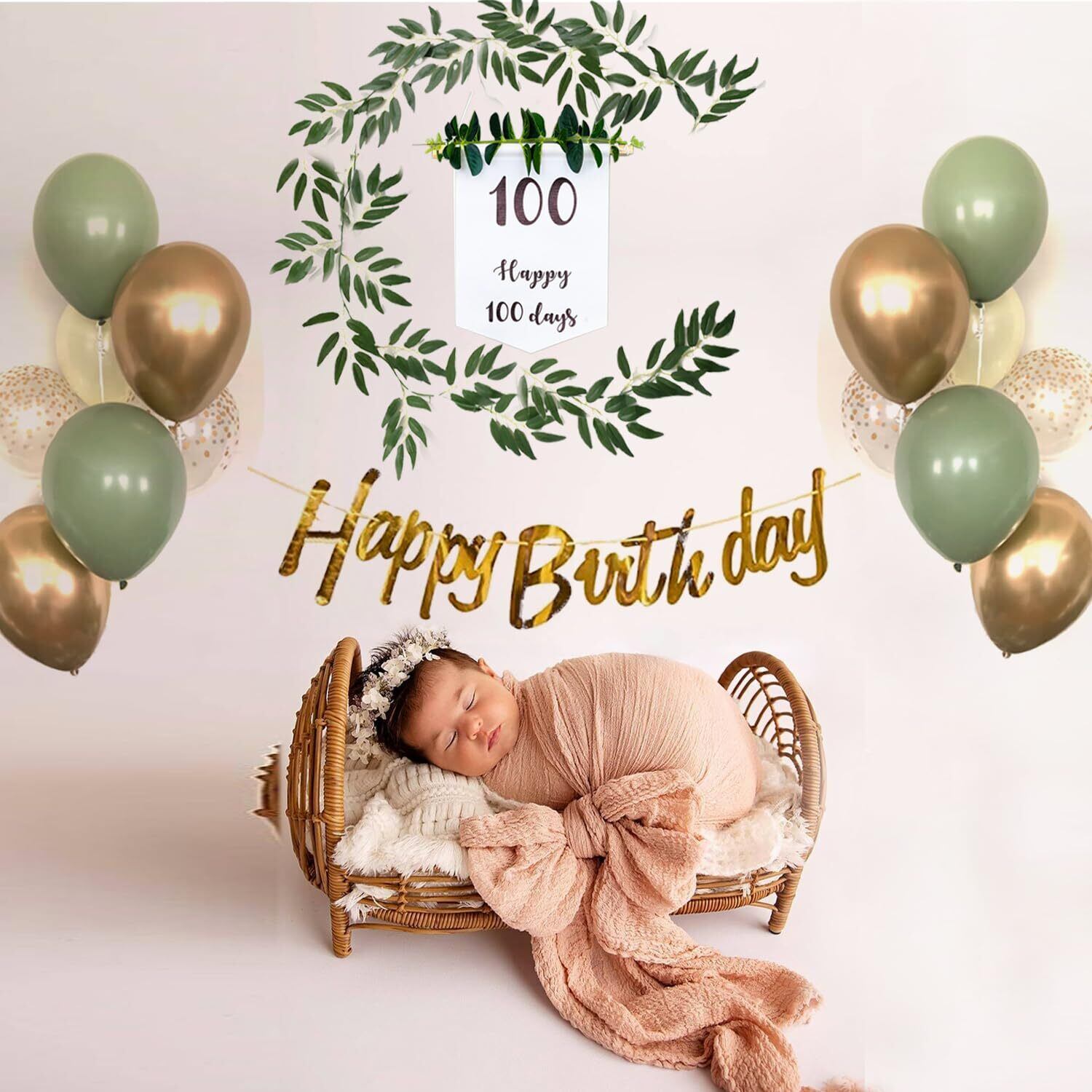 100日を迎えた赤ちゃんの写真をおしゃれに撮影- 誰でも簡単に飾り付けできるオールインワンセット、組み合わせに迷うことはもうありません インスタ映え間違えなしの写真が撮れます。壁に貼り付けて、お食い初めのお祝いの飾りに、そして温かみのある雰囲気です。