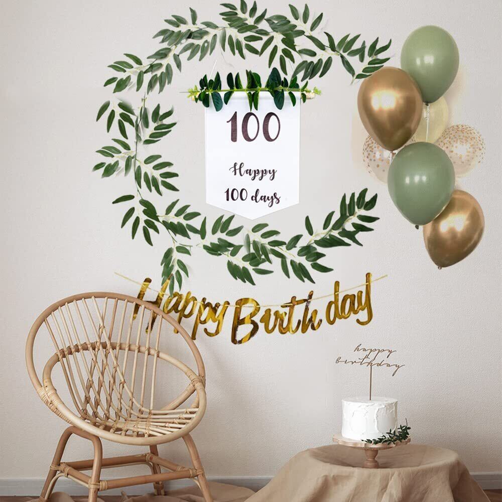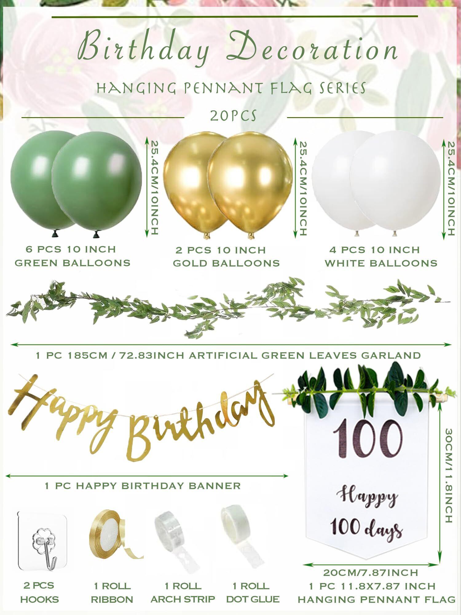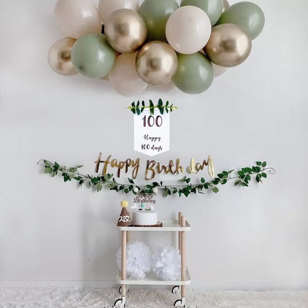充実のセット内容 - Happy Birthday 誕生日 ガーランドx1個(ゴールド)、100日祝いガーランド壁掛けx1、誕生日 風船x12(ゴールドx2、白い風船x4、マカロングリーンx6)、2m花藤x1、ロールドット接着剤x1、5m バルーンテープストリップx1、フックx2。そして質が高いですので、きちんと保存すれば、後にも持続に使用でき、コスパが高いです。