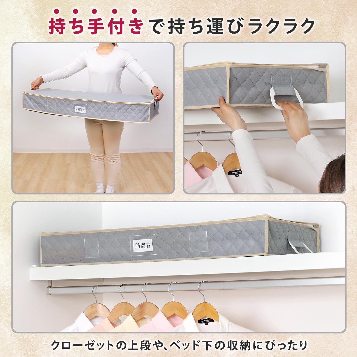 【ネームホルダー・防虫剤入れ・持ち手付き】:ネームホルダー付きでケースを開けずに中身が分かり管理しやすい。内側2か所に防虫剤入れポケット付き。持ち手付きで持ち運びも簡単。