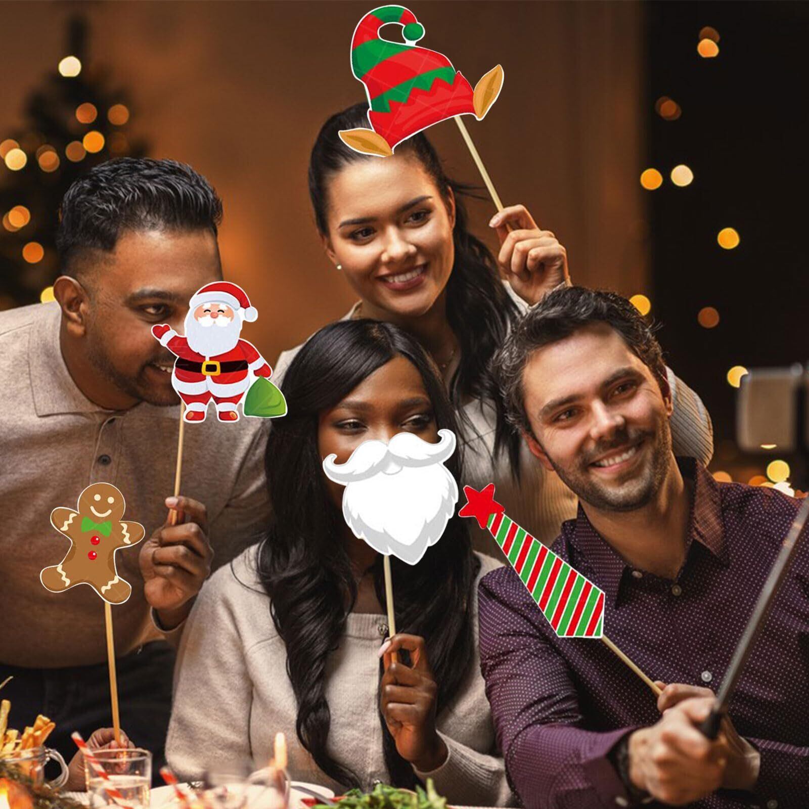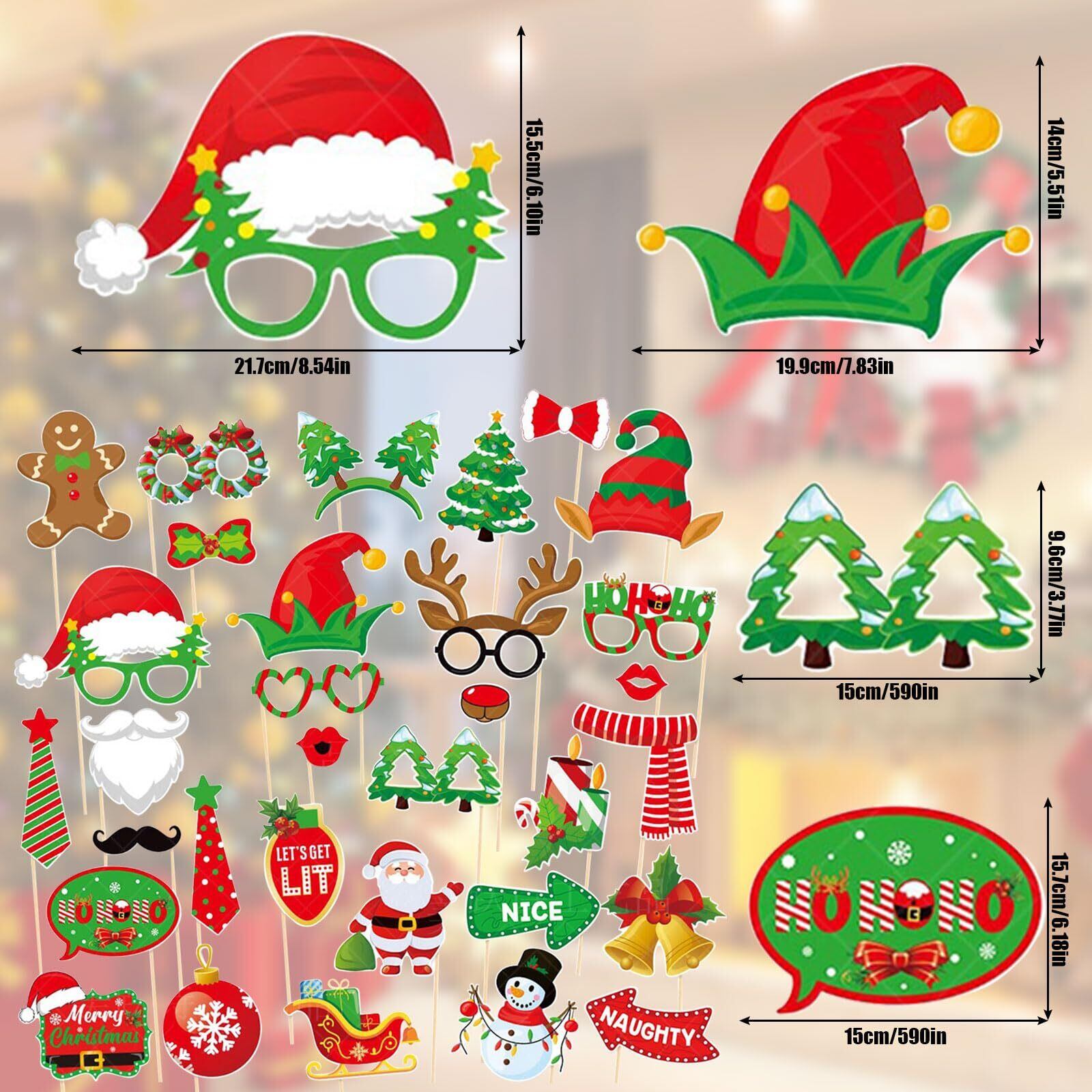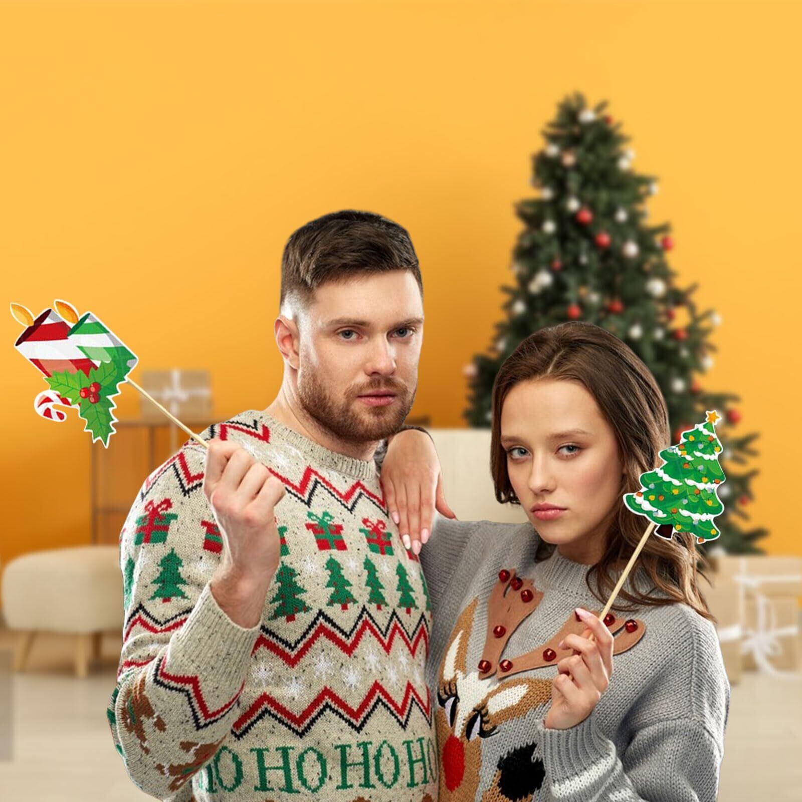 【使いやすい】この写真用小道具には木の棒と接着剤が付属しています。使用するときは自分で貼り付けて組み立てる必要があります。写真を撮るとき、組み立てられた小道具を手に取ると、さまざまなスタイルの写真を撮ることができ、かわいくて面白いです。さまざまなクリスマス要素が楽しいクリスマスの雰囲気を作り出します。