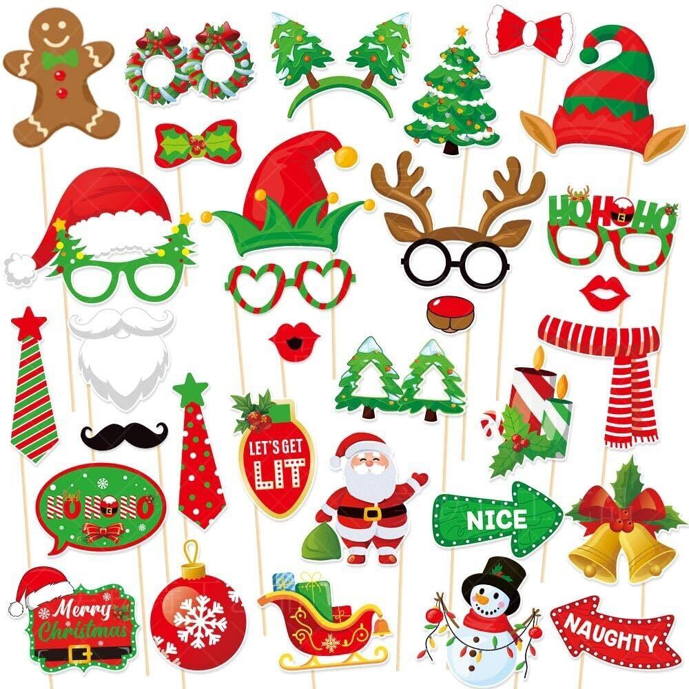 【かわいいデザイン】このクリスマスフォトプロップにはメガネ、唇、ひげ、ヘッドバンド、帽子、スカーフ、ネクタイなどが含まれており、サンタクロース、クリスマスツリー、トナカイ、ジンジャーブレッドマン、花輪、ベルなどの古典的なクリスマス要素が含まれています。カラフルでファッショナブルでクリスマス気分がいっぱいでとても楽しいです!