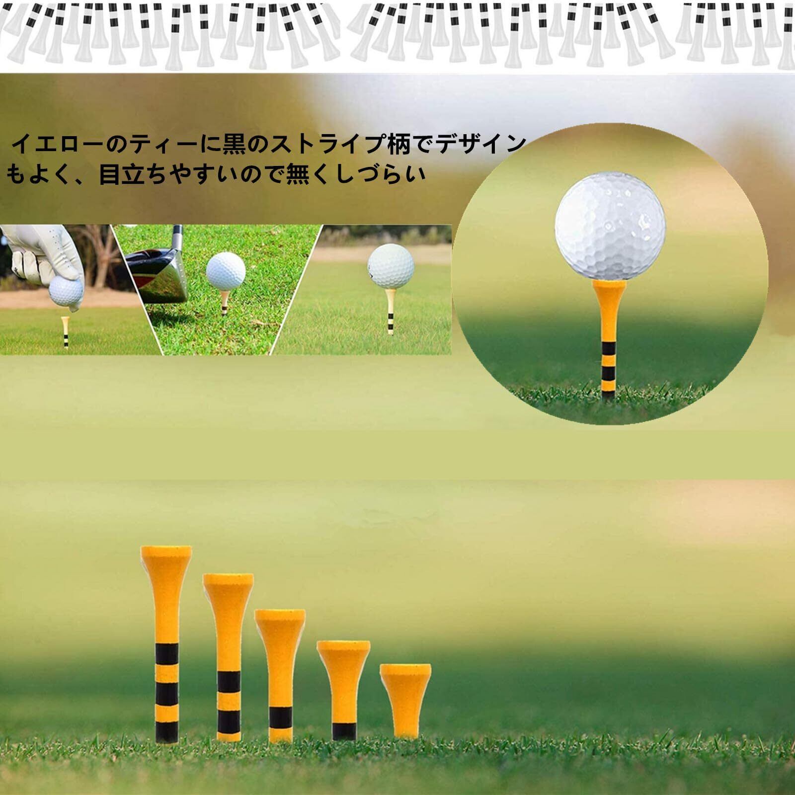 【洗練されたデザイン】ゴルフティーはイエローをベースに黒でボーダーラインをいれております。 イエローのティーに黒のストライプ柄でデザインもよく、目立ちやすいので無くしづらい。