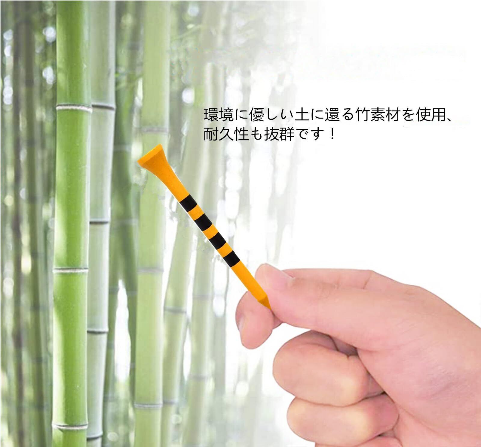 【耐久性に優れた】ゴルフティーはプラスチックではなく、環境にやさしい竹を採用しております。環境に優しい土に還る竹素材を使用しています。強度に優れた特別な竹を使用しているので、耐久性も抜群です!