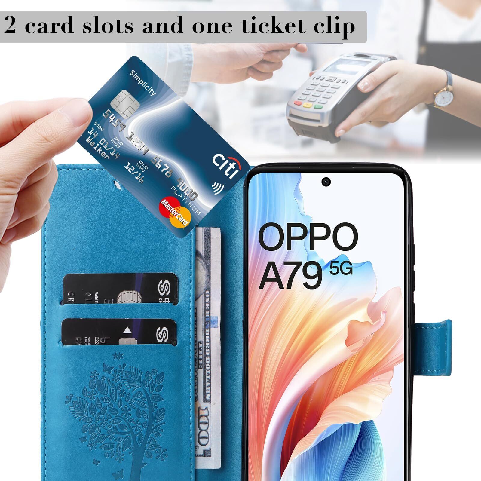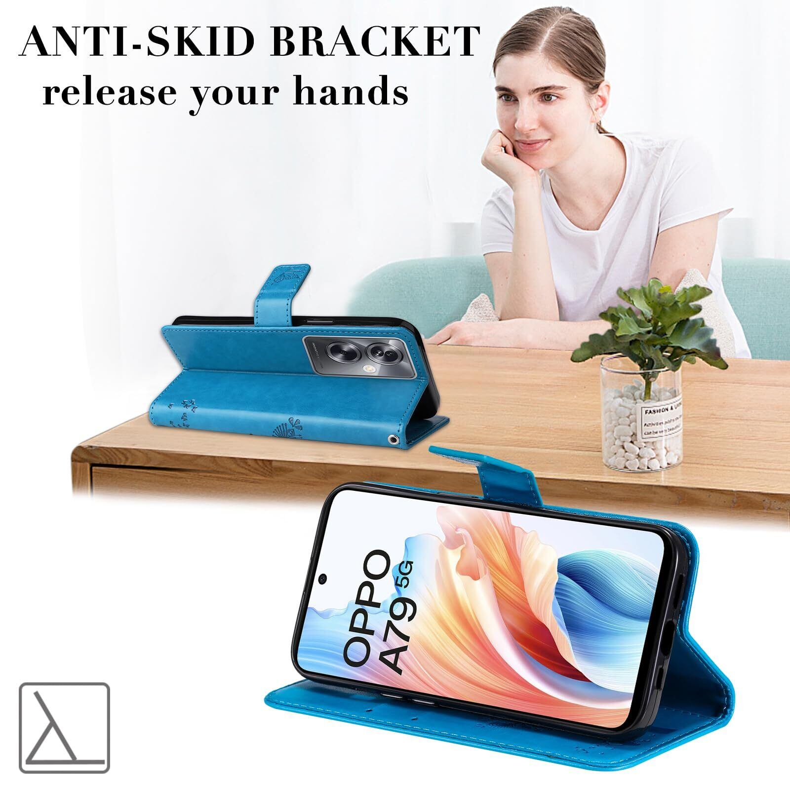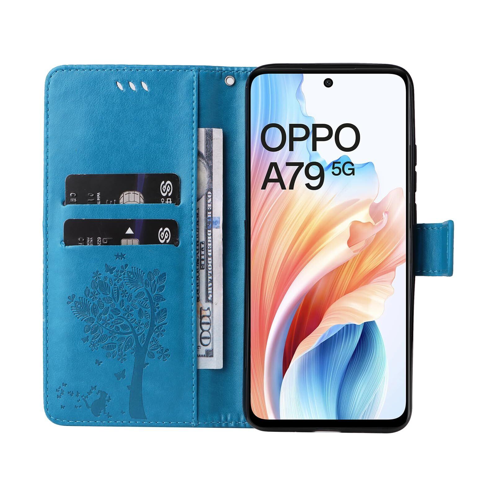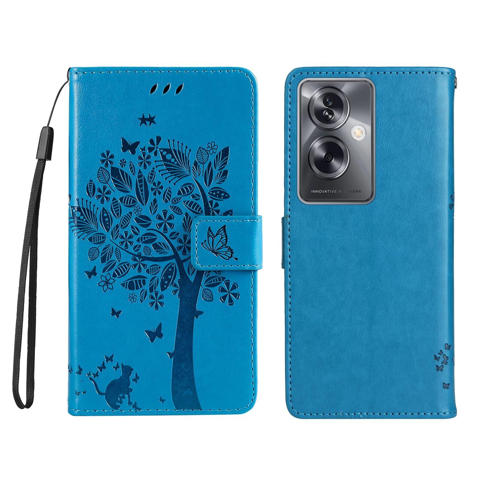 【Kawasina】OPPO A79 5G ケース 手帳型 おしゃれ 猫 蝶々 内蔵マグネット カードポケット スタンド機能 オッポ A79 5G ケース 防塵 軽量 耐衝撃 全面保護 (ブルー, OPPO A79 5G)