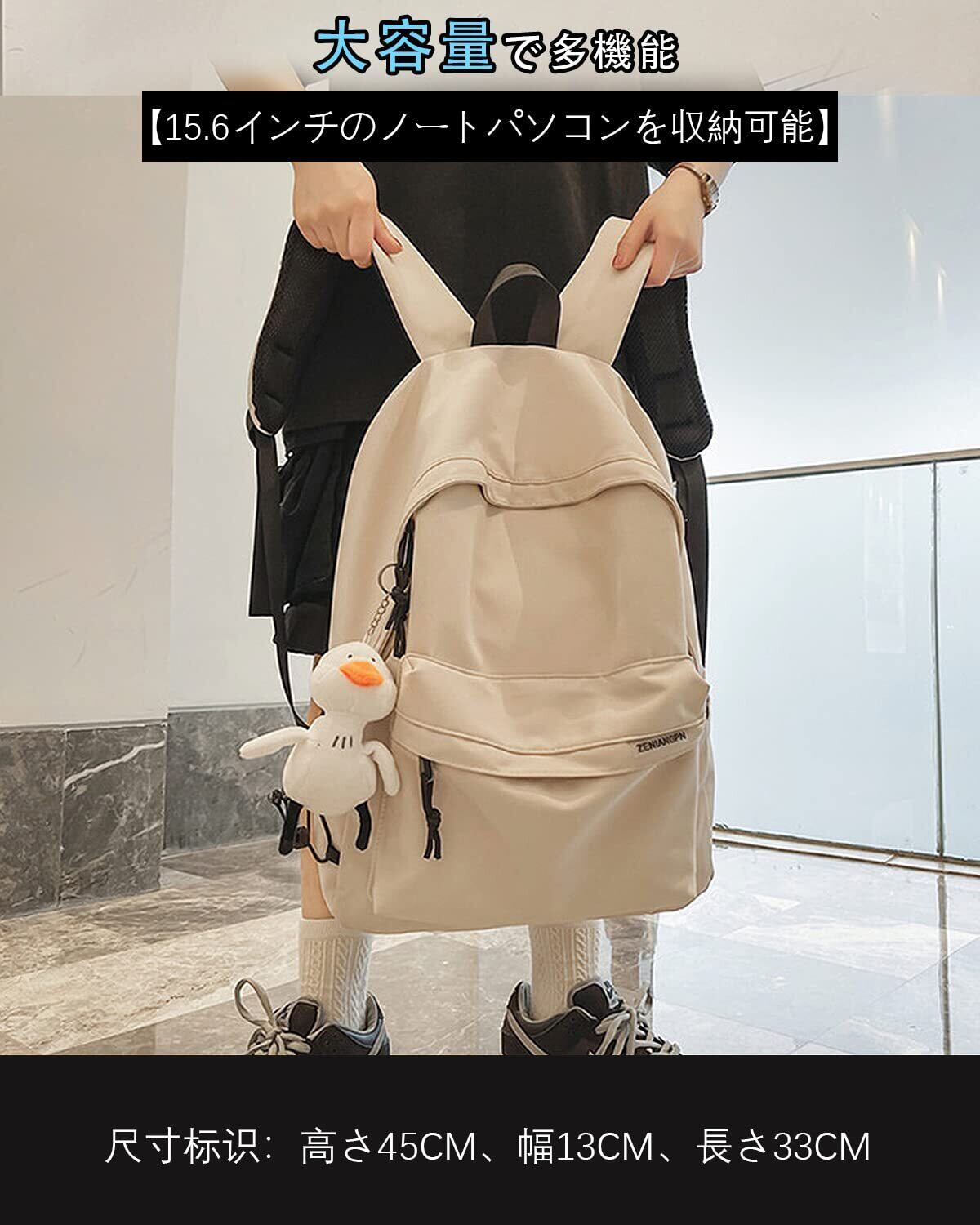 【大容量&多機能ポケット】15.6インチノートパソコン専用の独立コンパートメントを搭載。メイン収納スペースは本、昼食、軽量衣類、学用品、旅行用品など、日常の必需品をたっぷり収納可能。フロントには鍵やペン、鉛筆を収納できるファスナーポケットを配置。両サイドには水筒や傘を入れられるポケットを用意し、すべてのアイテムを整理して使いやすさを追求しました。※画像はイメージです。動物のペンダントは付属しません。