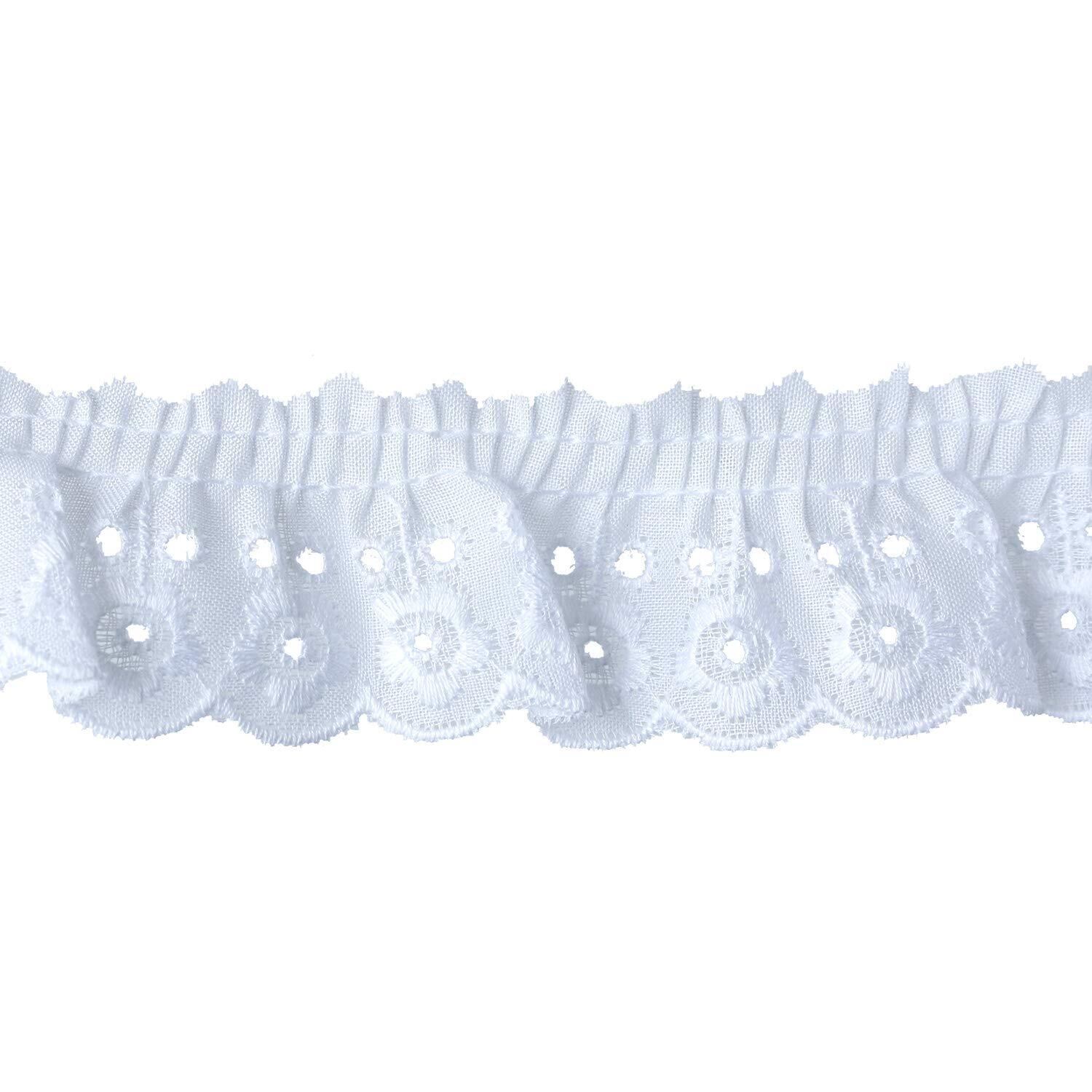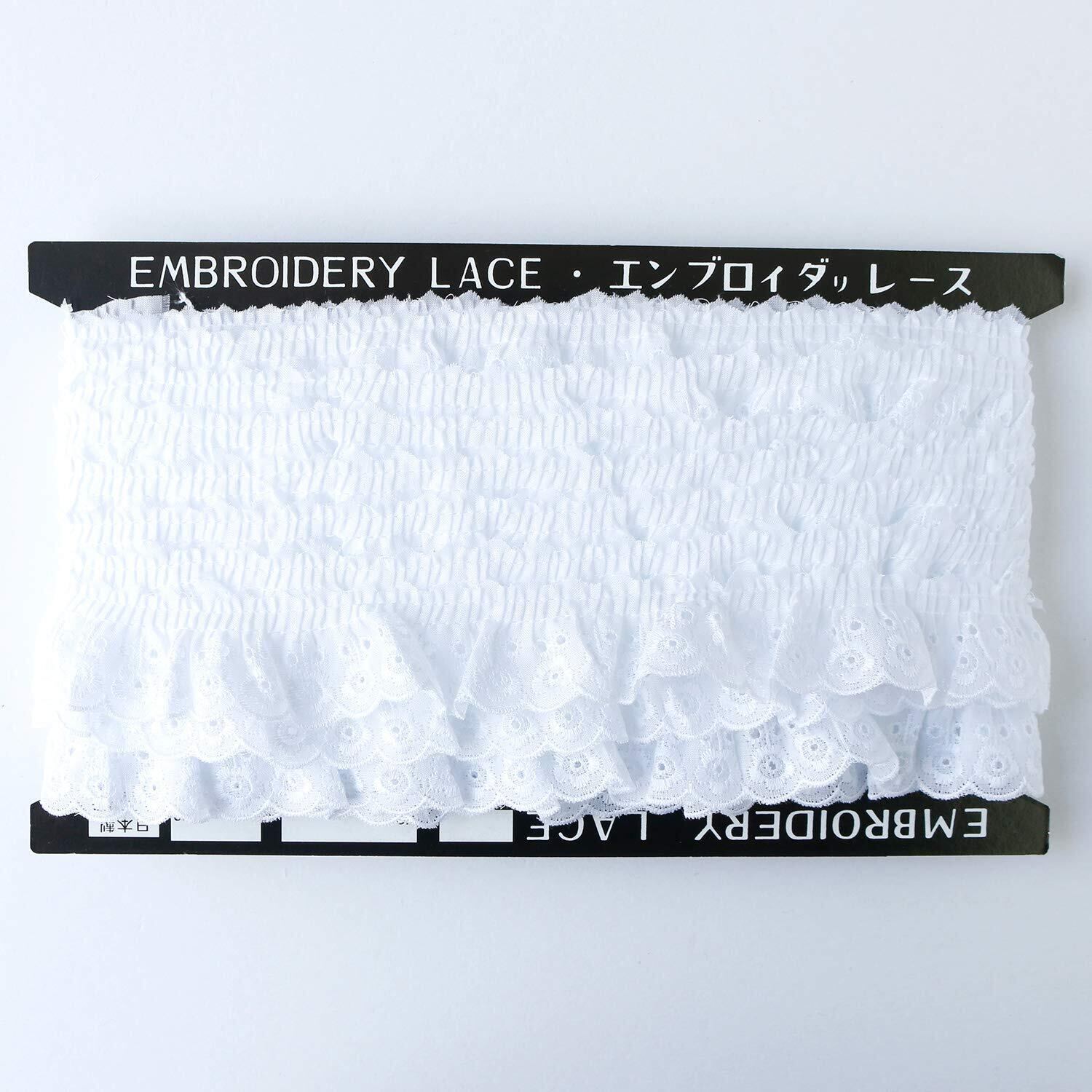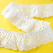 綿フリルレースとは…レースの中で最も広く使用される刺しゅうレースにシャーリング加工を施した可愛らしいレースです。