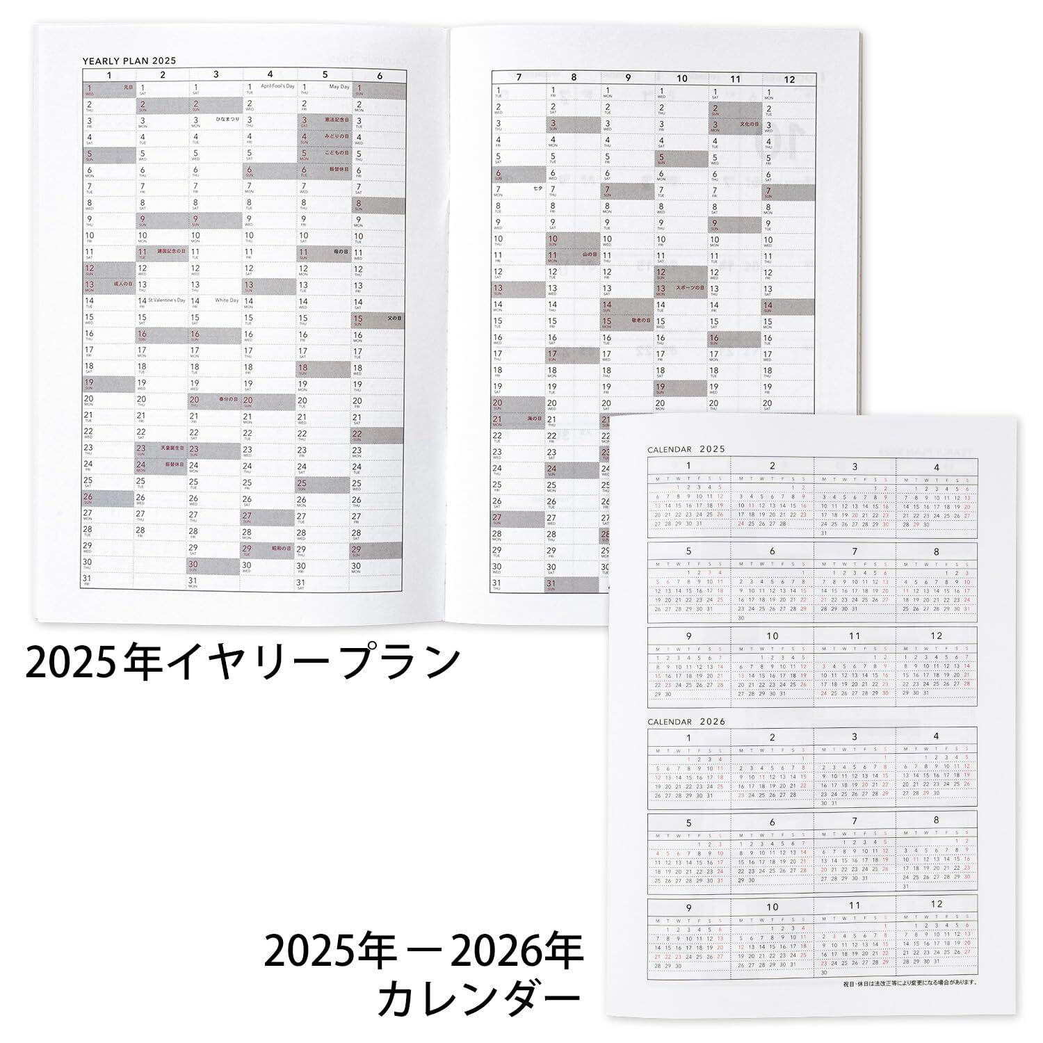 【内容】カレンダー1ページ/イヤリープラン2ページ/マンスリー32ページ/ノート28頁/パーソナル1頁
