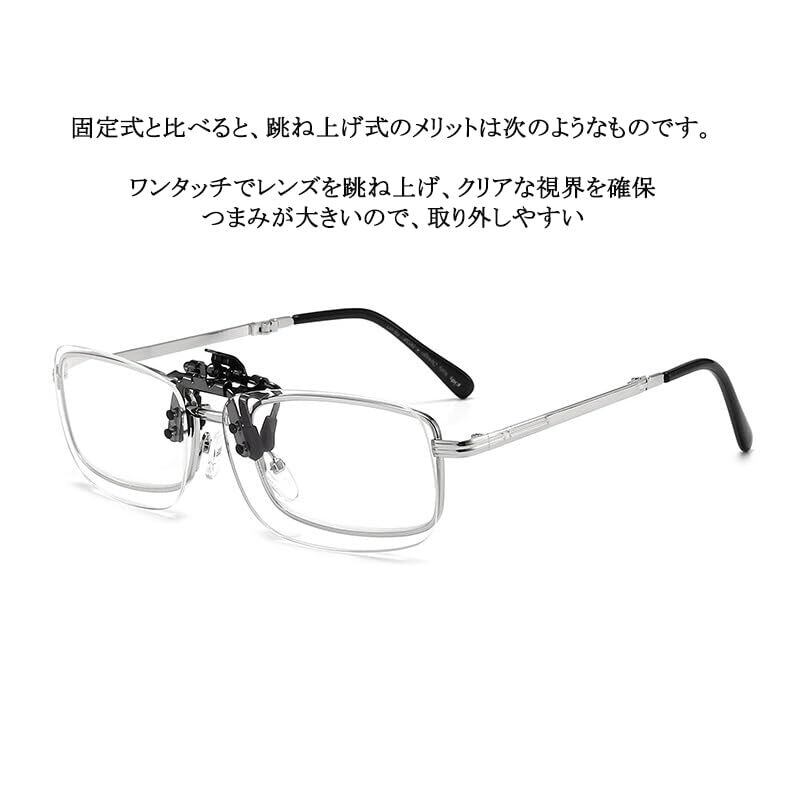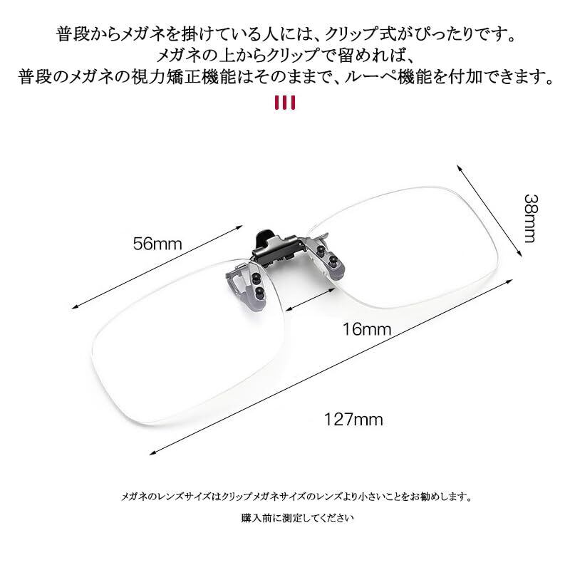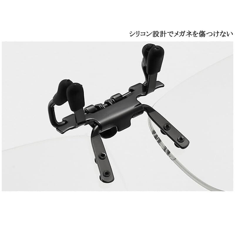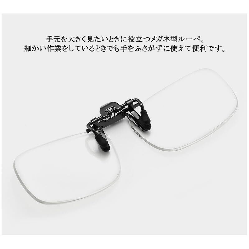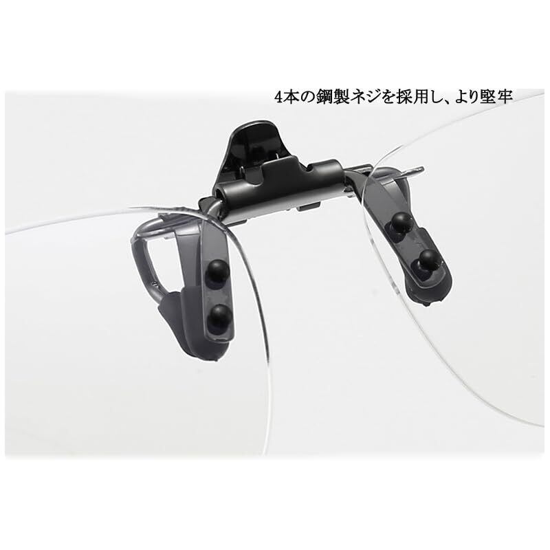 【着脱可能なきクリップアップ式拡大鏡】クリップ式拡大鏡でワンタッチで取り付けられます。お使いの眼鏡に挟むだけで一秒で装着完了です。また、跳ね上げ式なので、お使いにならない時には跳ね上げていい、掛け外しは不要でとても便利です。