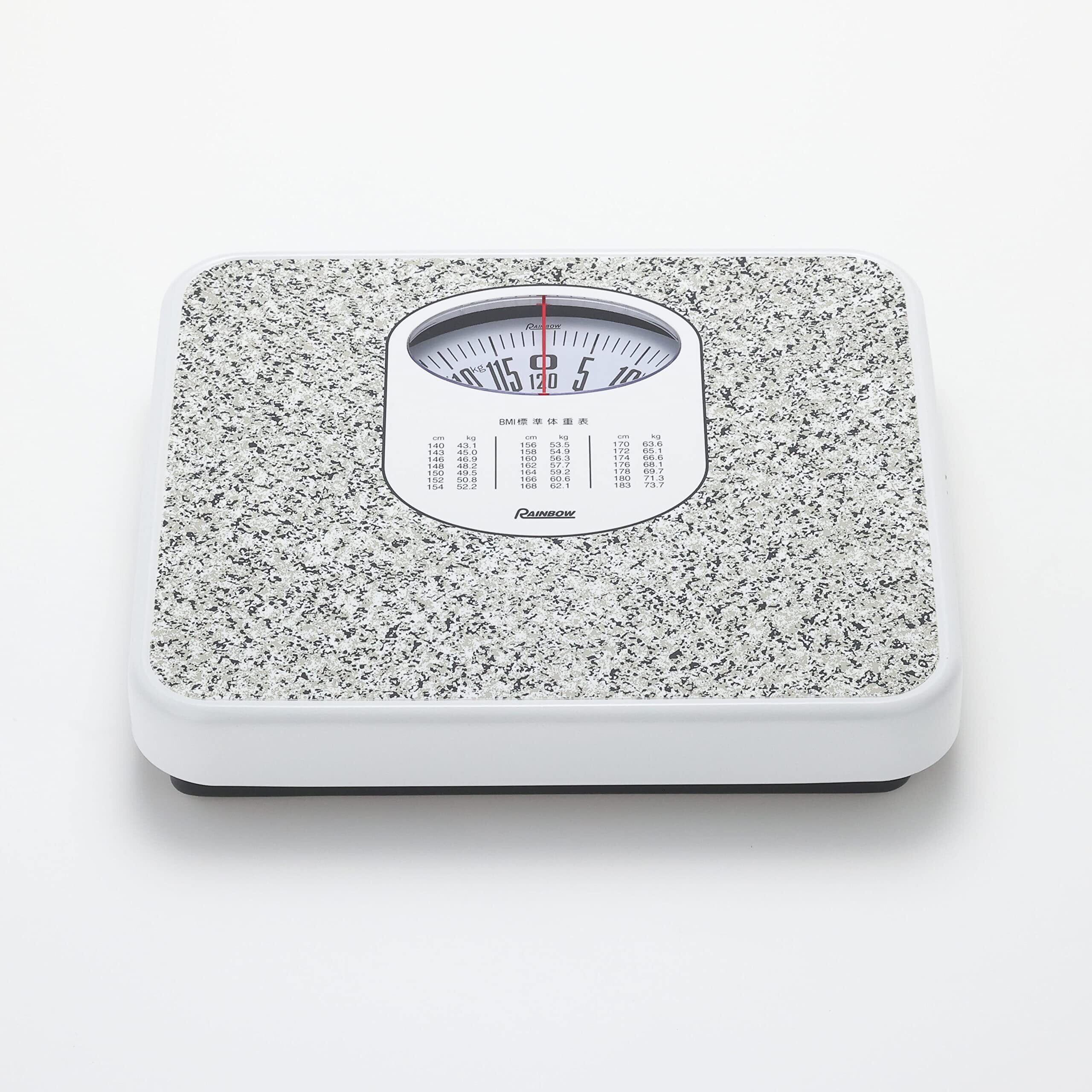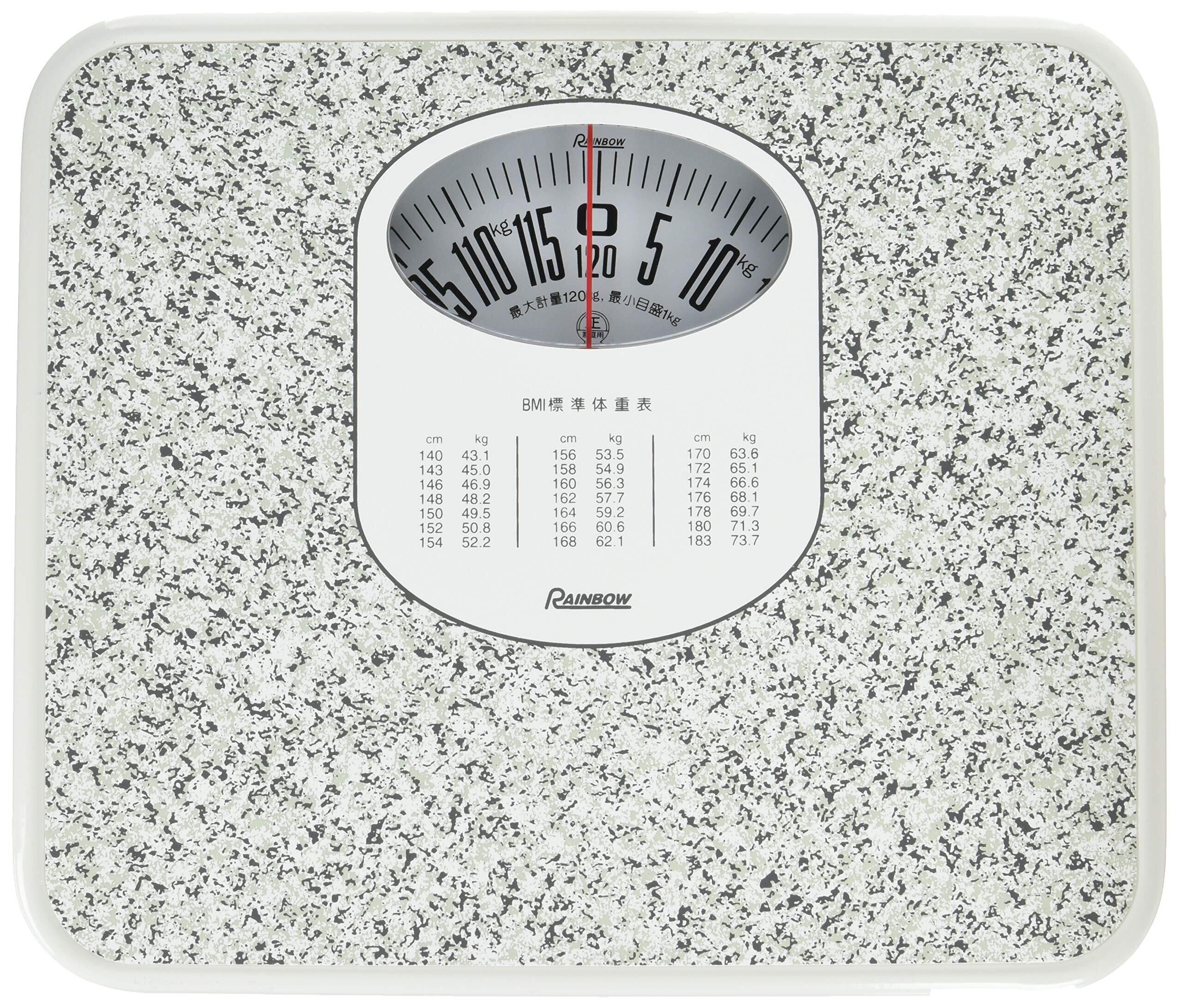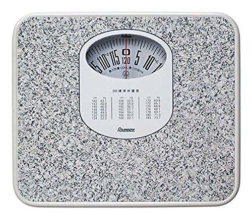 ●色:ストーンホワイト●ひょう量(最大計量):120 kg●主な材質:鋼板、塗装●最小表示:0 ~ 120 kgまで 1 kg●電源:-●表示方式:アナログ●商品寸法:幅 277mm × 高さ 50mm × 奥行 239mm●本体質量:約 1.6kg●個装箱寸法:幅 295mm × 高さ 60mm × 奥行 265mm●個装箱質量:約 1.8kg●製造国:中国●保証期間:1年