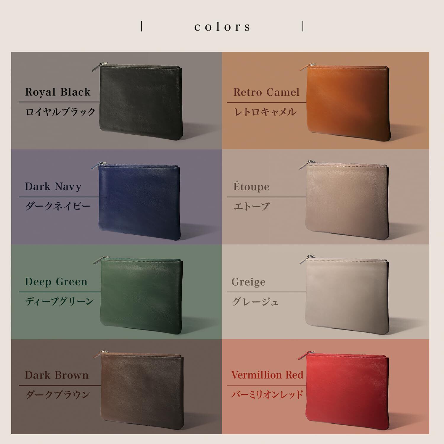 【 サイズ 】 縦15 × 横20 × 厚み1.5cm 【 重さ 】 約95g 【 収納力 】 メインスペース×1 【 素材 】 牛本革 フルグレイン プレミアムレザー(ベジタブルタンニン鞣し) 【 カラー 】 ロイヤルブラック・グレージュ・レトロキャメル・ダークネイビー・ディープグリーン・バーミリオンレッド・ダークブラウン