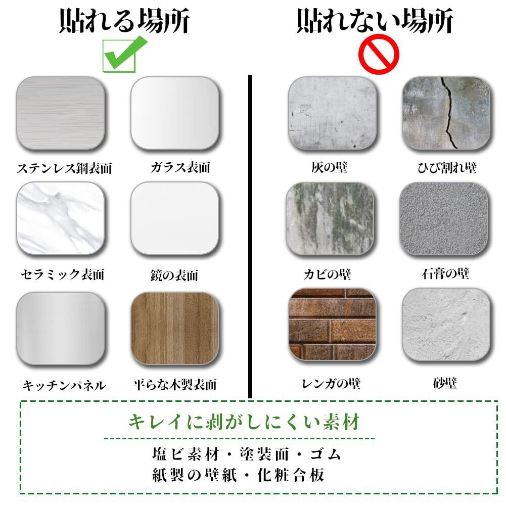 貼る対象物のほこりや汚れをきれいに取り除いてから施工してください。タイルシールを貼り付ける前に、壁体表面が滑らかで平らな状態を保証してください。例えば、セラミック表面、鏡の表面、ガラス表面、平らな木製表面などです。粗くて凹凸のある表面に貼り付けるのに適用していません。例えば、レンガの壁、砂壁、石膏の壁、剥がれやすい壁紙、ひび割れ壁、灰の壁などです。