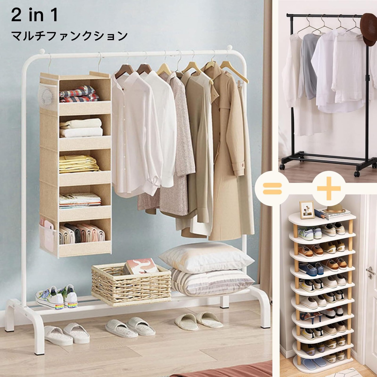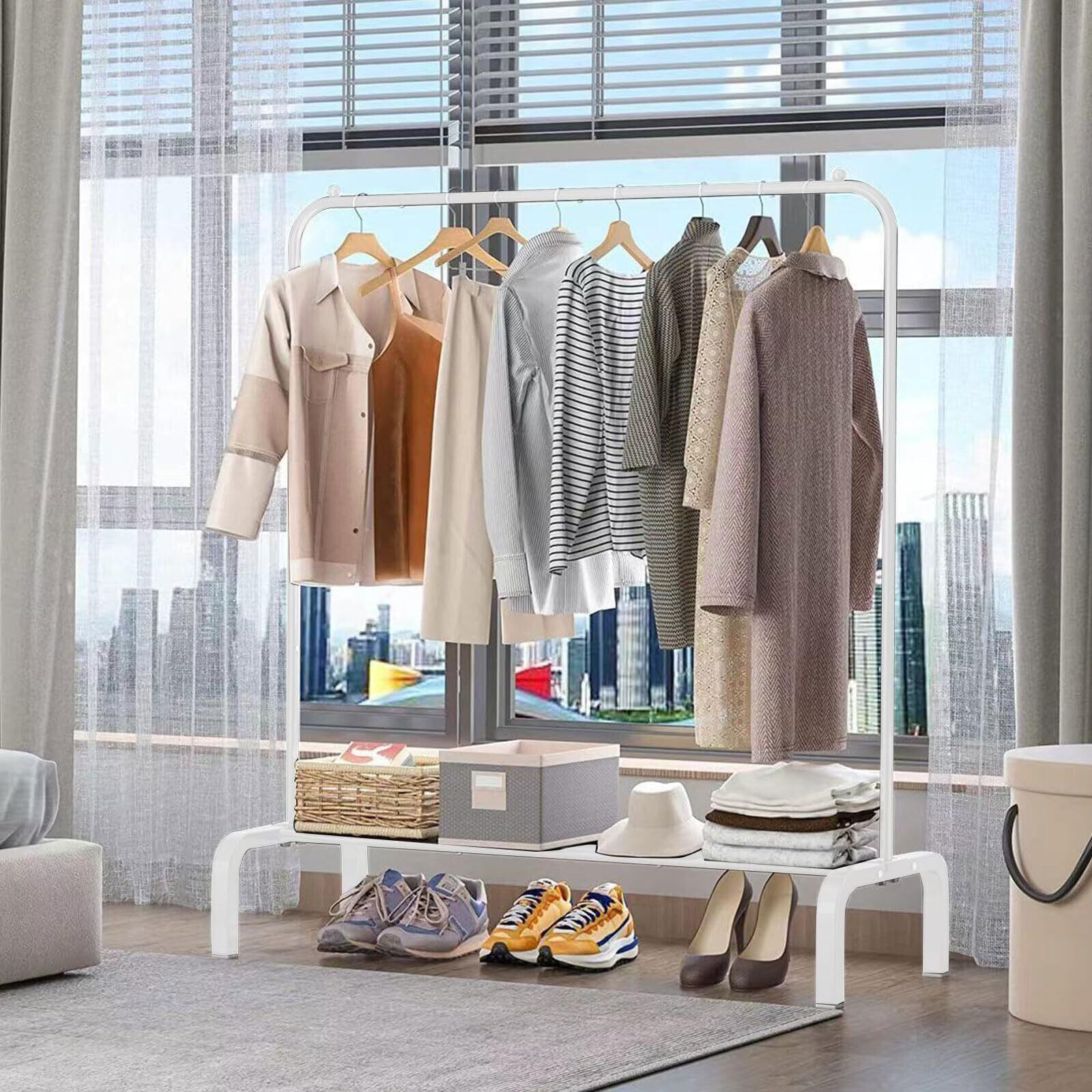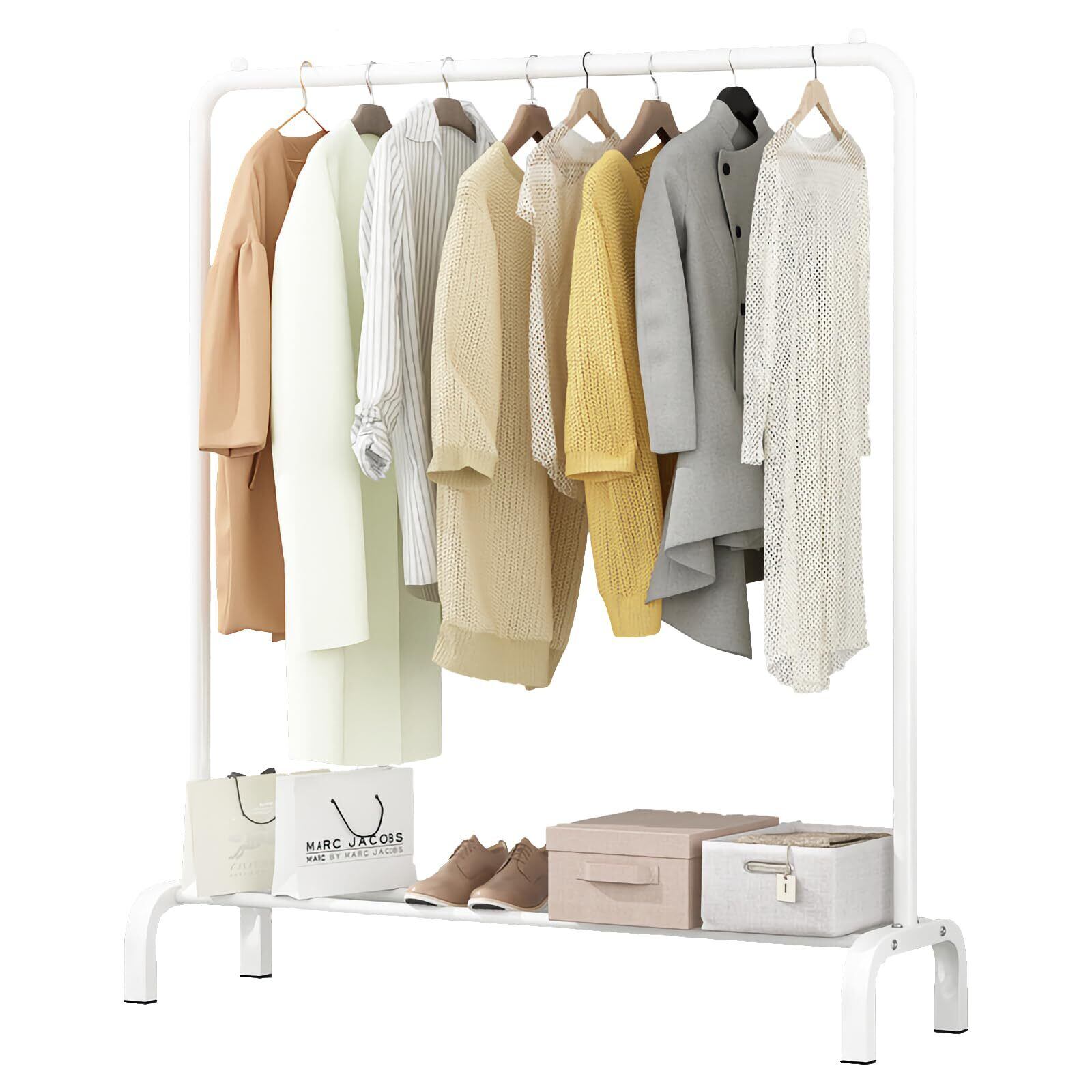 【スペースを活用】:ハンガーラック 狭いお部屋でもスペースを効果的に活用して、靴、帽子、衣類などを整理整頓できます。ロングコートやワンピースなどの長い衣類も十分に収納可。
