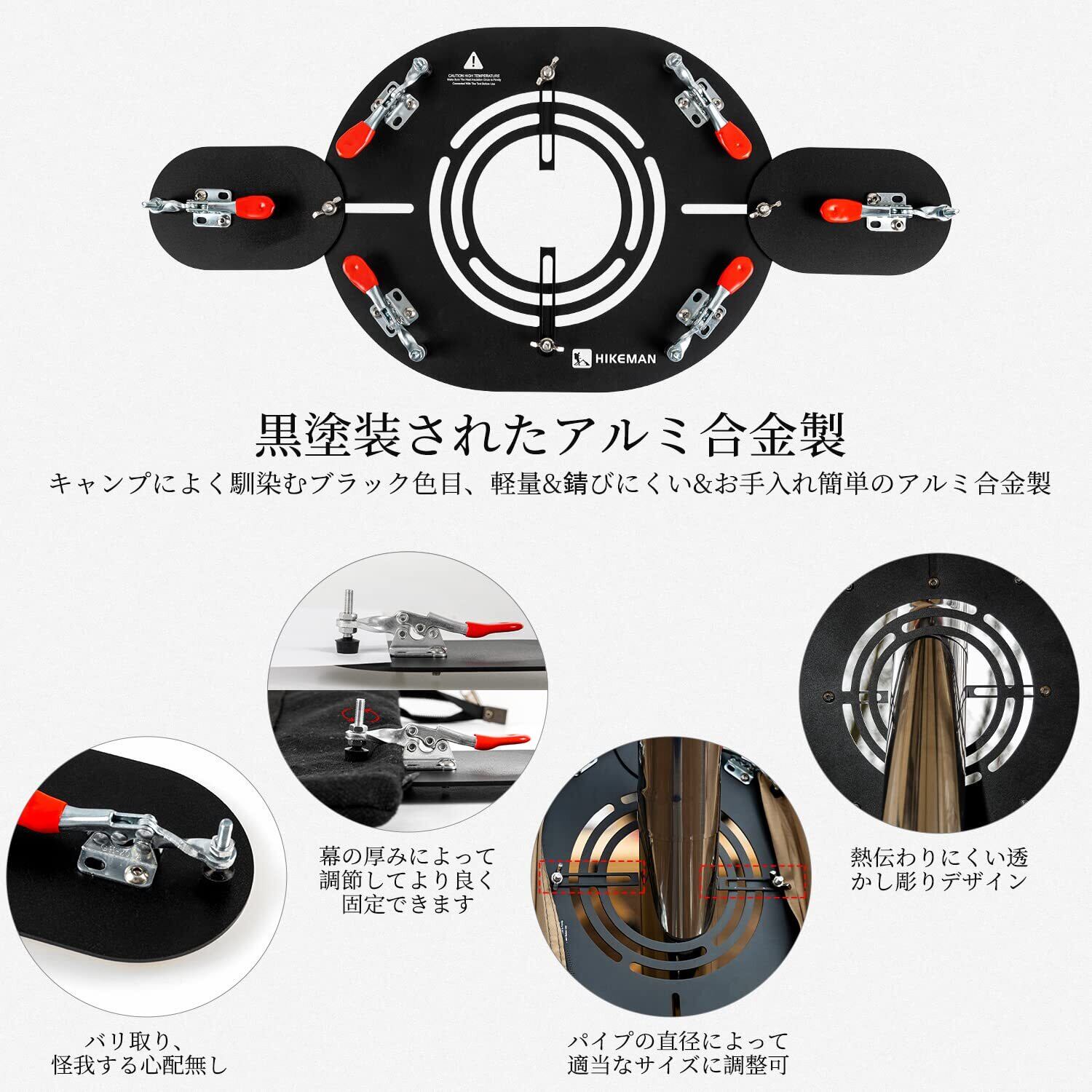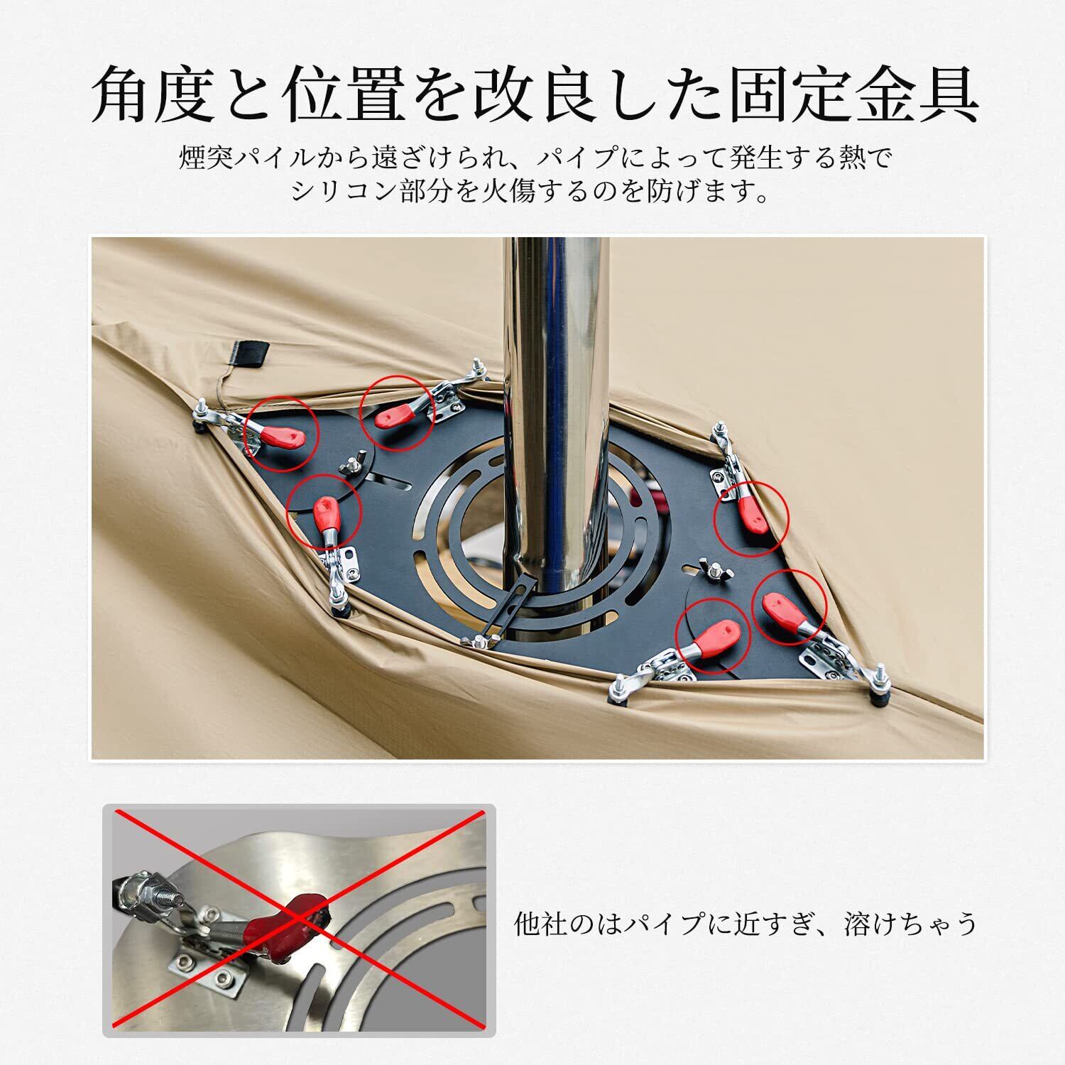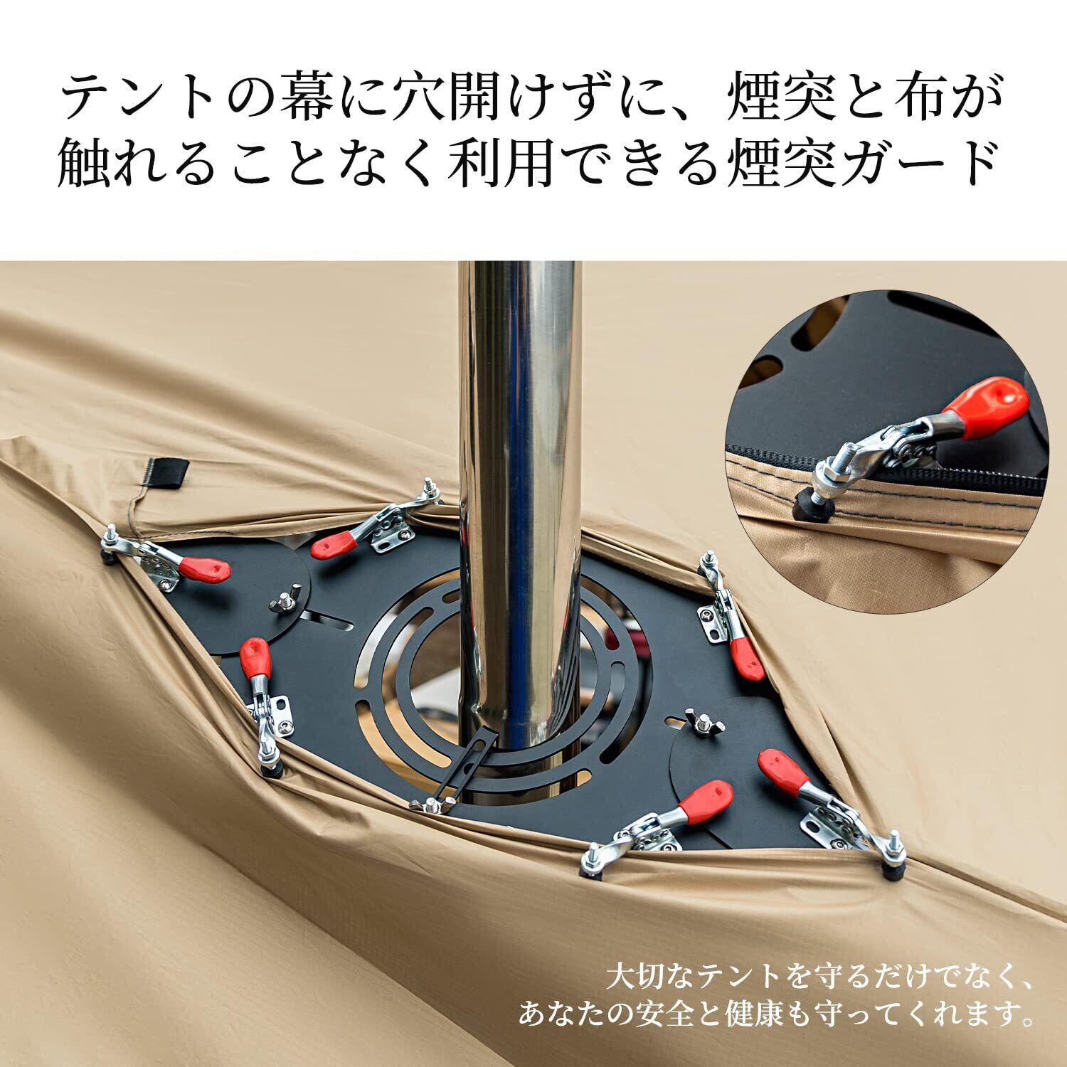 テント保護&熱対策:透かし彫りをしていて熱伝わりにくく、風通しも良くなります。熱をより素早く排出することができます。高温の心配がありません。煙突ガードがテントに挟むところはゴムなので、大切なテントを穴開けずに使用できます。布が煙突パイプと接触することなく、熱で焦げてしまう心配がなくなります。