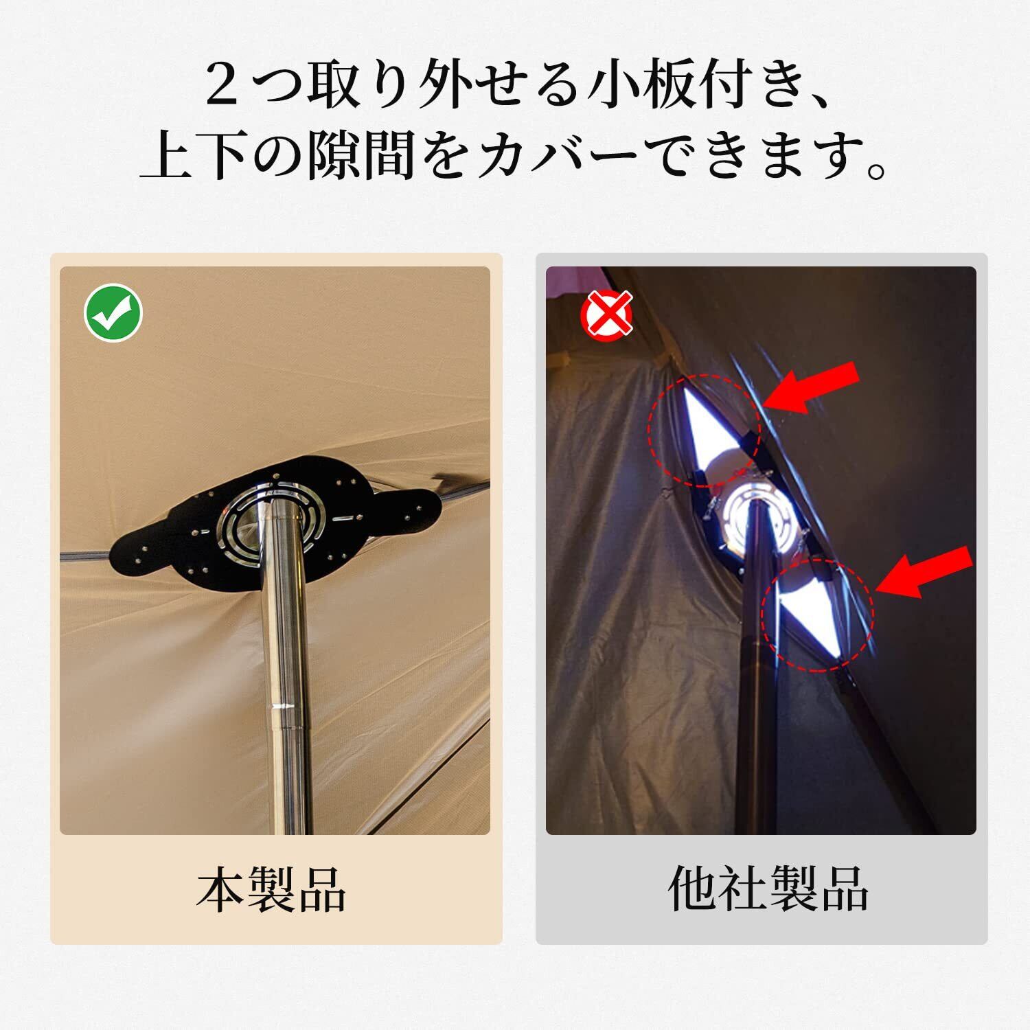 位置調整可の小板2つも付き:「普通の煙突ガードは装着すると、テントの上下にどうにも隙間が出てしまい、困ります」そういうお客様の声から考えた設計です。固定位置を拡張して上下の隙間を良くカバーできます。使う場面によってテントプロテクターの小板を位置調整したり、取り外したりするのもできますので使い勝手が抜群です。