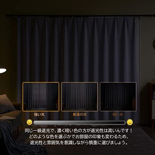 ◆【一級遮光】このカーテンは遮光度が99.99%以上,外からの光をほとんど通さないため、昼間カーテンを閉めたお部屋のなかで相手の顔の表情が分からない程度にまでお部屋を暗くできます。同じ等級であっても、カーテンの明度や色彩によって遮光の度合いが変わります。薄い淡い色は光を通しやすく、濃い暗い色は光を通しにくいです。遮光性を重視される方は濃色をおすすめします。