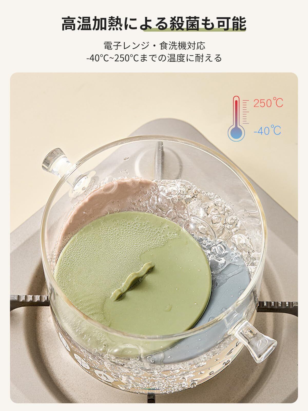 【耐寒性と耐熱性】シリコン製の蓋は-40°Cから250°Cまでの高温に耐えます。 加熱して沸騰させる使用する場合、カップ内の液体の飛び散りや沸騰を防ぐことができます。 冷蔵庫で使用すると食品の鮮度を保ちます。