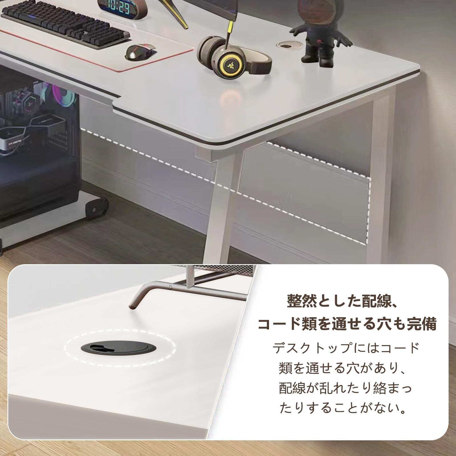 このゲームテーブルのU字フレームは、横板のデザインは構造が安定で、揺れにくい。配線穴付属し、体をデスクに近づける、適度に柔らかくて、体に当たらない。PCデスク・勉強机・ゲーミングデスク・ミシン台・パソコンデスク・学習机・pc作業机など様々な使い方ができます。