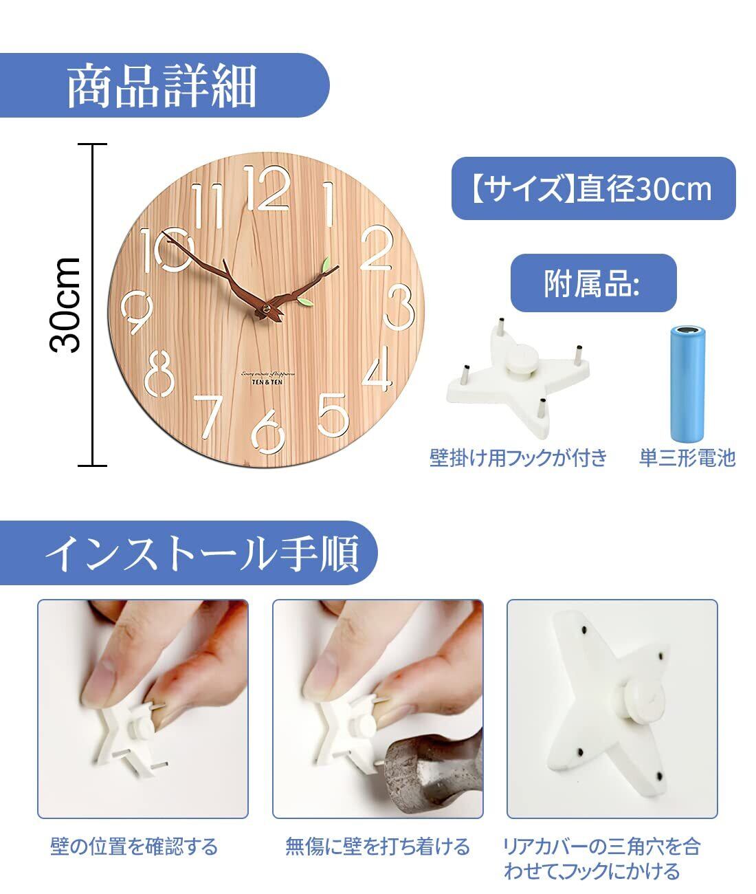 【素材】環境に優しい木材で作られています。大きなアラビア数字が刻まれており、きくて子ども達も時間がわかりやすい。 おしゃれで和室、洋室に置いてもしっくりと馴染みます。簡単に掛けるだけであっという間におしゃれな空間に早変わり!