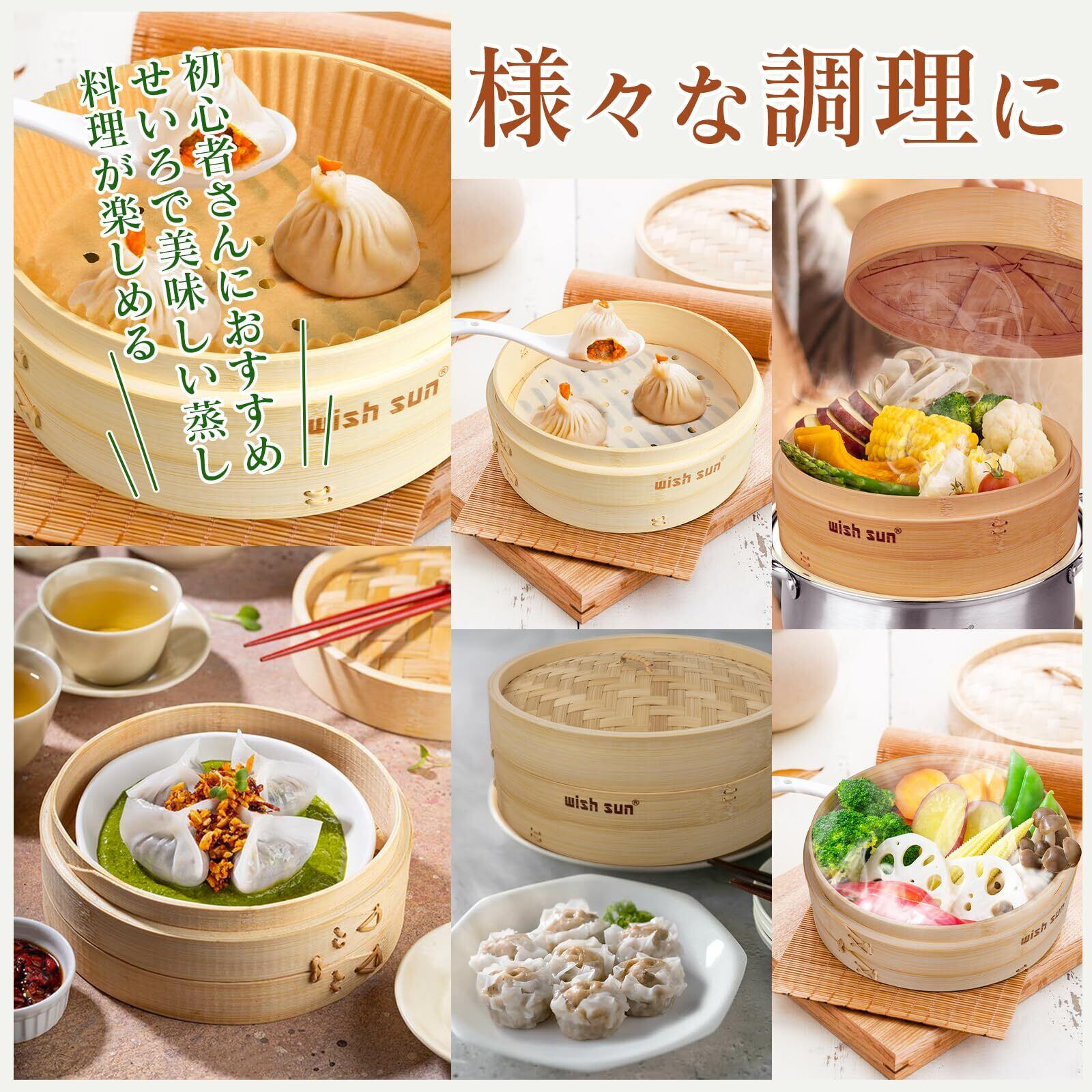 WISH SUN 竹 せいろ 蒸籠 蒸しせいろ せいろ蒸し器 2段 中華蒸籠 天然竹 蒸し料理 小籠包 茶碗蒸し 21cm 深型 本体・蓋 本体2個セット せいろ専用シート50枚入り 鍋なし