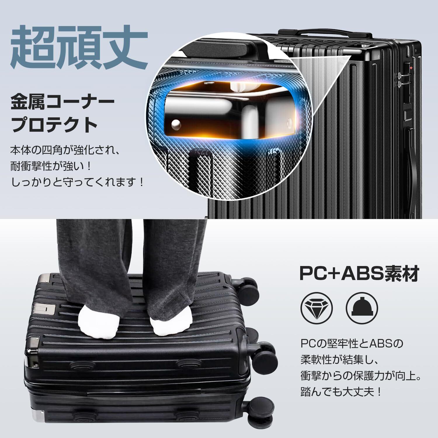 【耐衝撃・静音キャスター・調整可能キャリバー】金属コーナープロテクト付きで、本体の四角が強化され、耐衝撃性が強い!しっかりと守ってくれます!高弾性TPE衝撃軽減素材のキャスターを採用し、より静かで耐摩耗性も向上しています。スムーズな滑りを実現しながら、360度の自由回転もできます。ボタン一つでキャリーバーの高さを調節できます。Sは2段階調整、MとLは1段階調整可能のハンドル キャリーバー、耐久性も抜群。