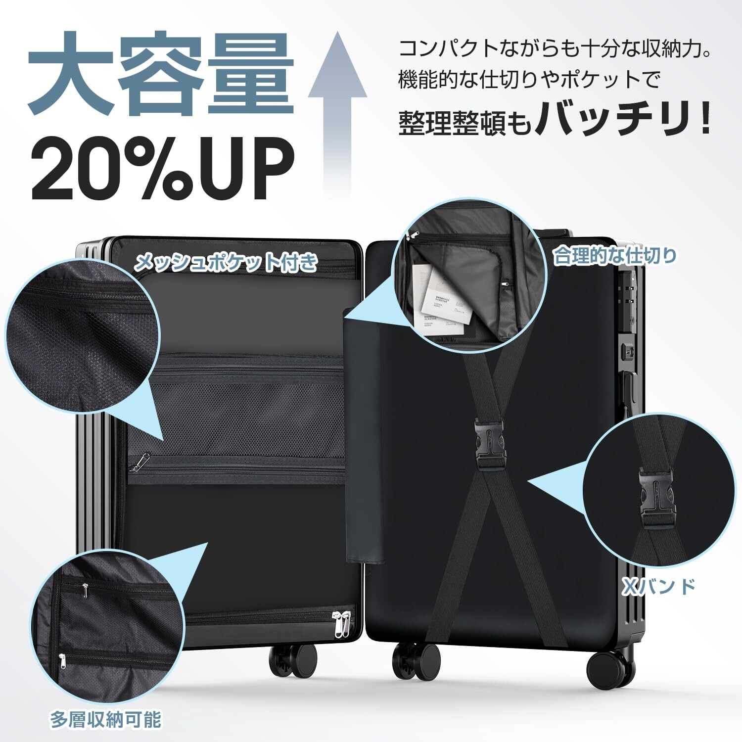 【市場最軽量・超大容量】市場最軽量仕様として、一般的なスーツケースより、平均1kg重さが遠います。長時間スーツケースをもって移動する場合や頻繫に出張、旅行の方におすすめです。Sサイズ、機内持ち込みにも最適です。さらに、メッシュポケット内蔵され合計4箇所メイン収納があります。大容量収納×合理的なデザイン、コンパクトながらも十分な収納力があります!機能的な仕切りやポケットで整理整頓もバッチリ!大容量なスーツケースは収納便利、旅行や故郷帰りなど最適なスーツケースです。