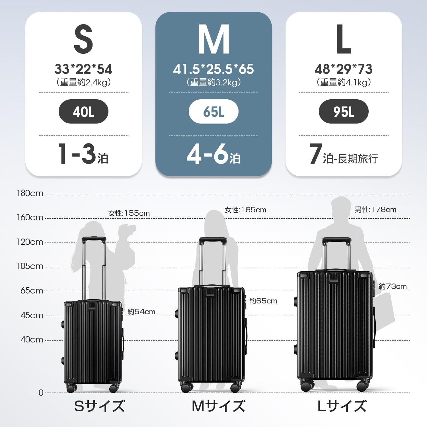 【5カラー・3サイズ】Sサイズ(機内持ち込みOK): 33*22*54cm(重量約2.4kg)、容量約40L(1~3泊対応);Mサイズ:41.5*25.5*65cm(重量約3.5kg)、容量約65L(4~6泊対応);Lサイズ:48*29*73cm(重量約4.1kg)、容量約95L(7泊以上対応)ビジネスからレジャーまで、シーンに合わせて選べるカラーバリエーション。自分らしい色を見つけて、旅先でも個性を光らせましょう。※サイズ測定には多少の誤差がありご了承ください。※画像と実物のカラーがお客様のデバイスやデバイスの設定によってイメージと若干異なる場合もございます。