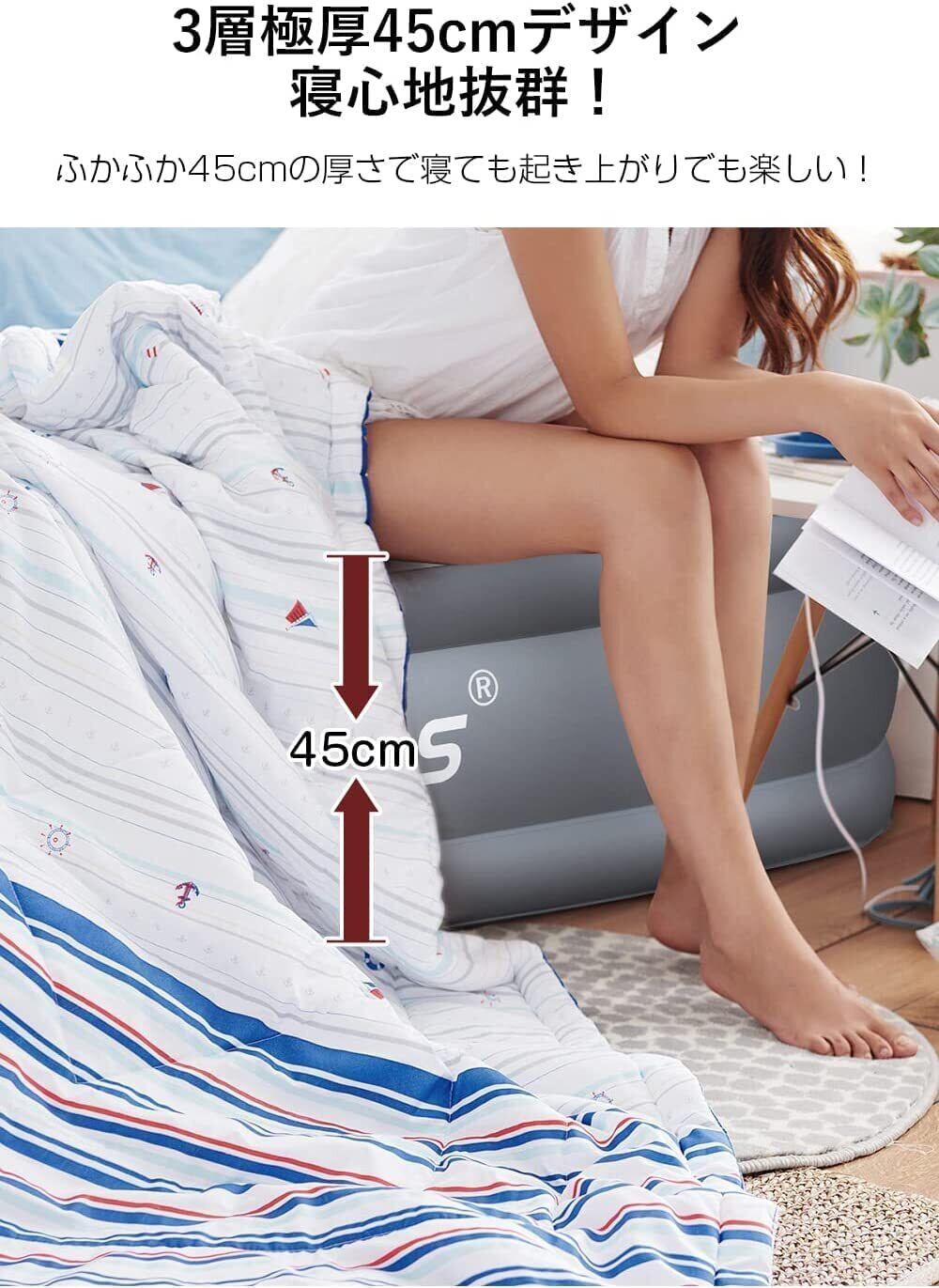 【極厚・約3分で完成】空気の出し入れは自動で、電源を入れて約3~5分待つだけで寝心地の良いベッドが完成します。空気を抜く時も電動式で、力が必要なく簡単にベッドメイキングが完了します。空気の注入量で硬さを調整でき、最大で45cmの高さまで膨らみ、柔らかな寝心地を実現します。