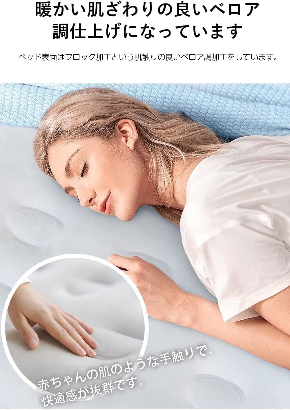 【柔らかい肌触り】表面にはやわらかいベロア生地を使用し、肌に優しく心地よい肌ざわりが感じられます。ソフトフロックの表面加工とベッド内部の空気室でちょうど良い柔らかさを実現し、環境に優しいPVC生地で作られています。保温性・防湿性に優れた材質で、1年を通して使用できます。