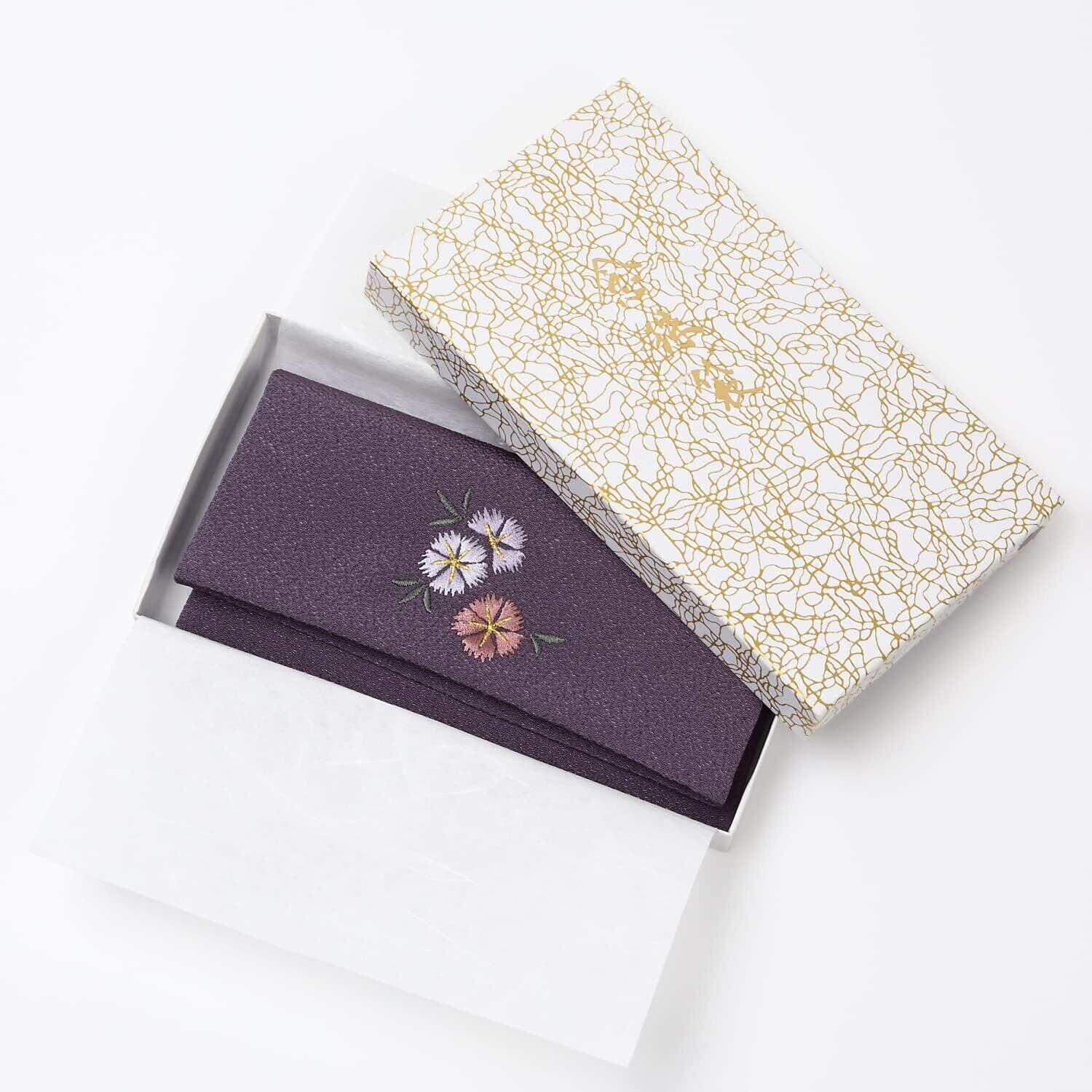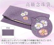 女性用 数珠袋 レディース 二つ折 ちりめん 刺繡入 京念珠 念珠入れ ポーチ ケース 外箱付 日本製/紫 パープル ( 撫子 )