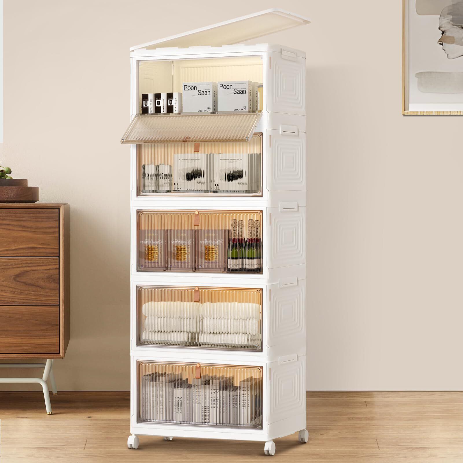 ホームブリス 収納ボックス 積み重ね 折り畳み収納ボックス 前開き 蓋付き 収納ケース マグネット式扉 キャスター付き 組立簡単 透明 おしゃれ 小物/衣類/書類/化粧品/靴 省スペース 防塵 防湿 無臭 多機能 強い耐荷重 家庭用 5段式 一体型 (39cm*27.9cm*104cm,113.2L)