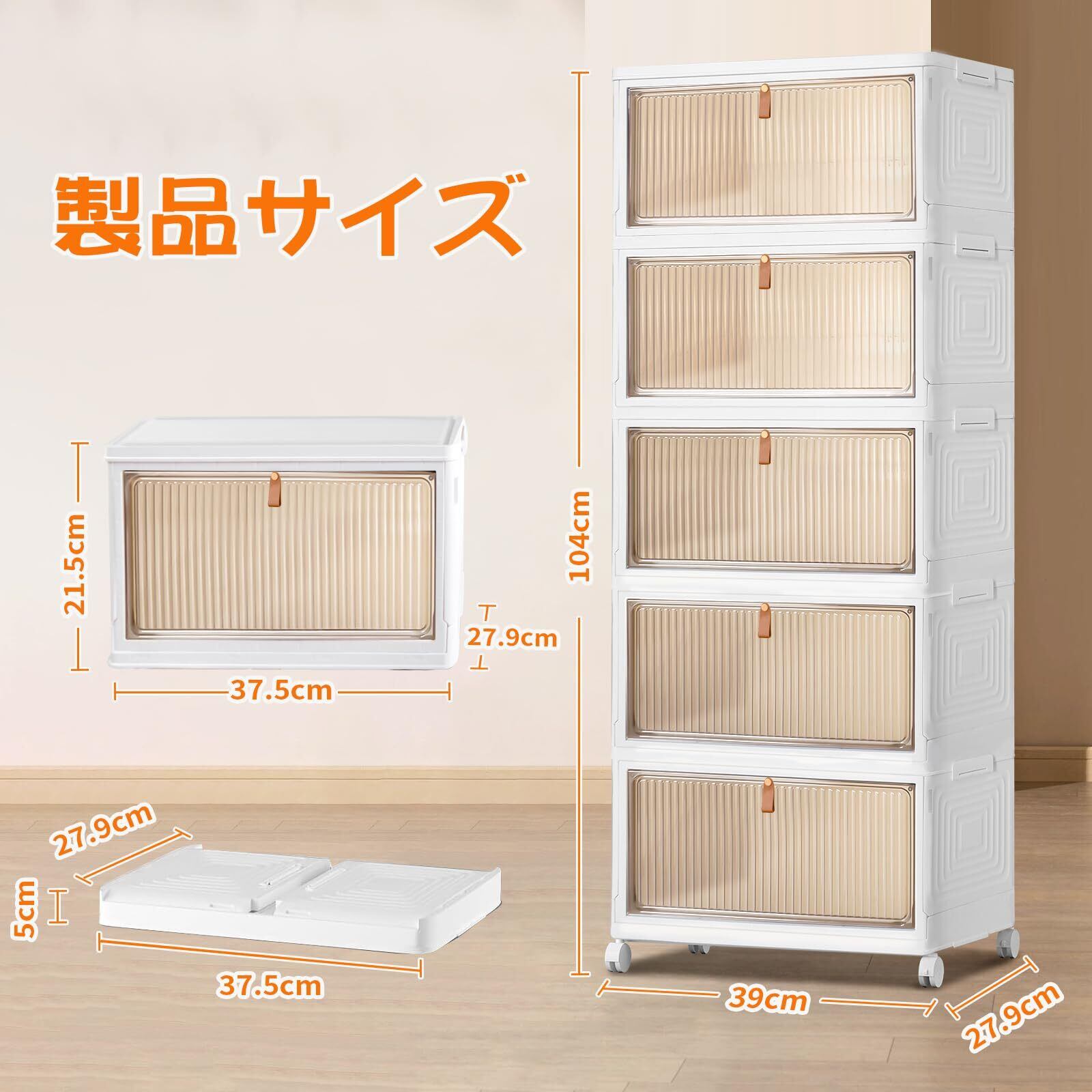 【113.2L収納ボックス】:5段式衣装ケースのサイズは39cm*27.9cm*104cm、一個あたりのサイズは37.5cm*27.9cm*21.5cmです。最大収納容量は113.2Lで、衣類、ファイル、スナック、シューズなどの収納に特に適しています。 キッチン、オフィス、寝室、バスルーム、ランドリールーム、玄関などに最適です。