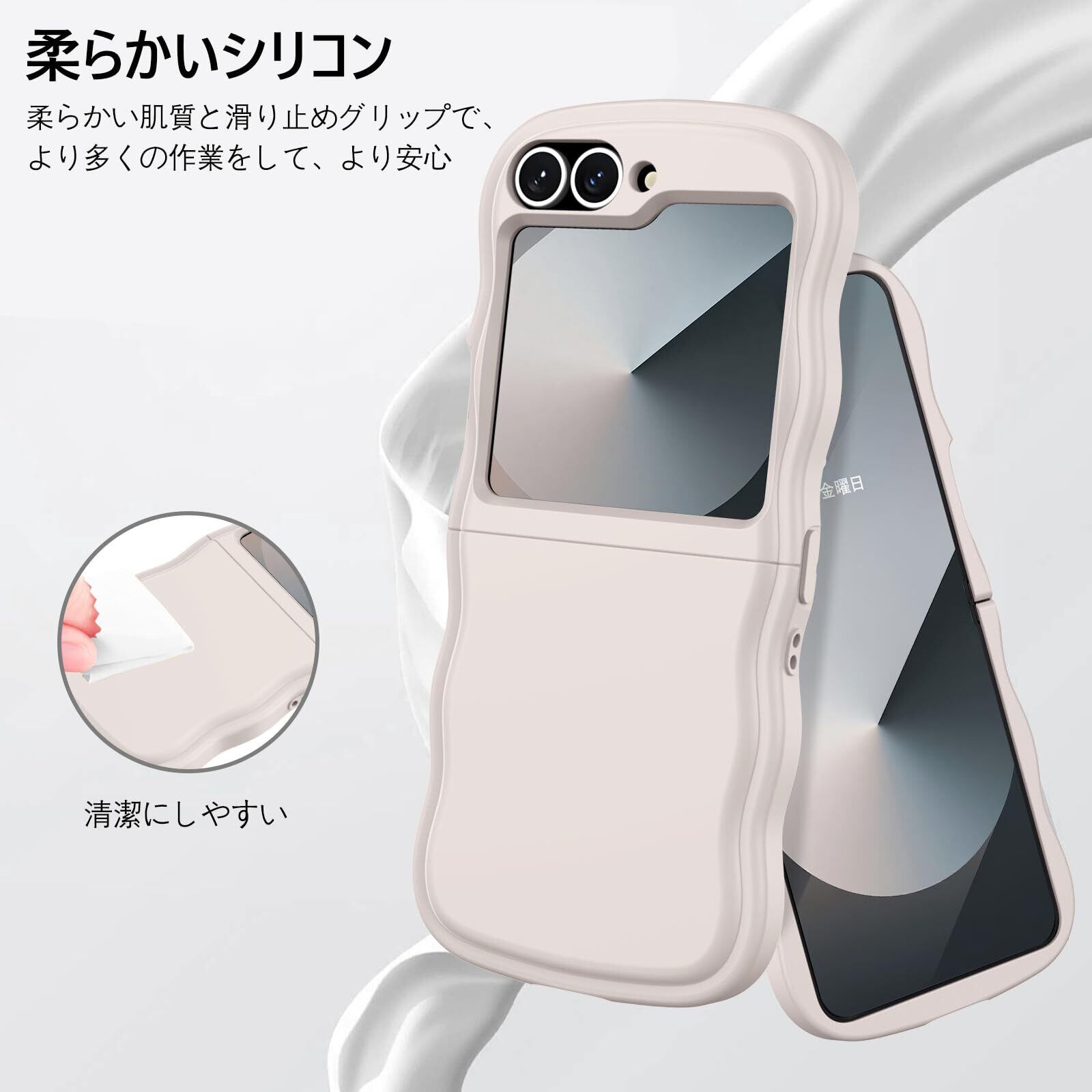 【ウェーブ湾曲縁&肌触り】湾曲したエッジにより握りやすくなっています。Samsung Z Flip5 / Galaxy Z Flip6 5G 用ケースは柔らかいシリコンゴムで、耐傷性、耐指紋性、耐衝撃性に優れ、取り外しも簡単,お手入れし易い。