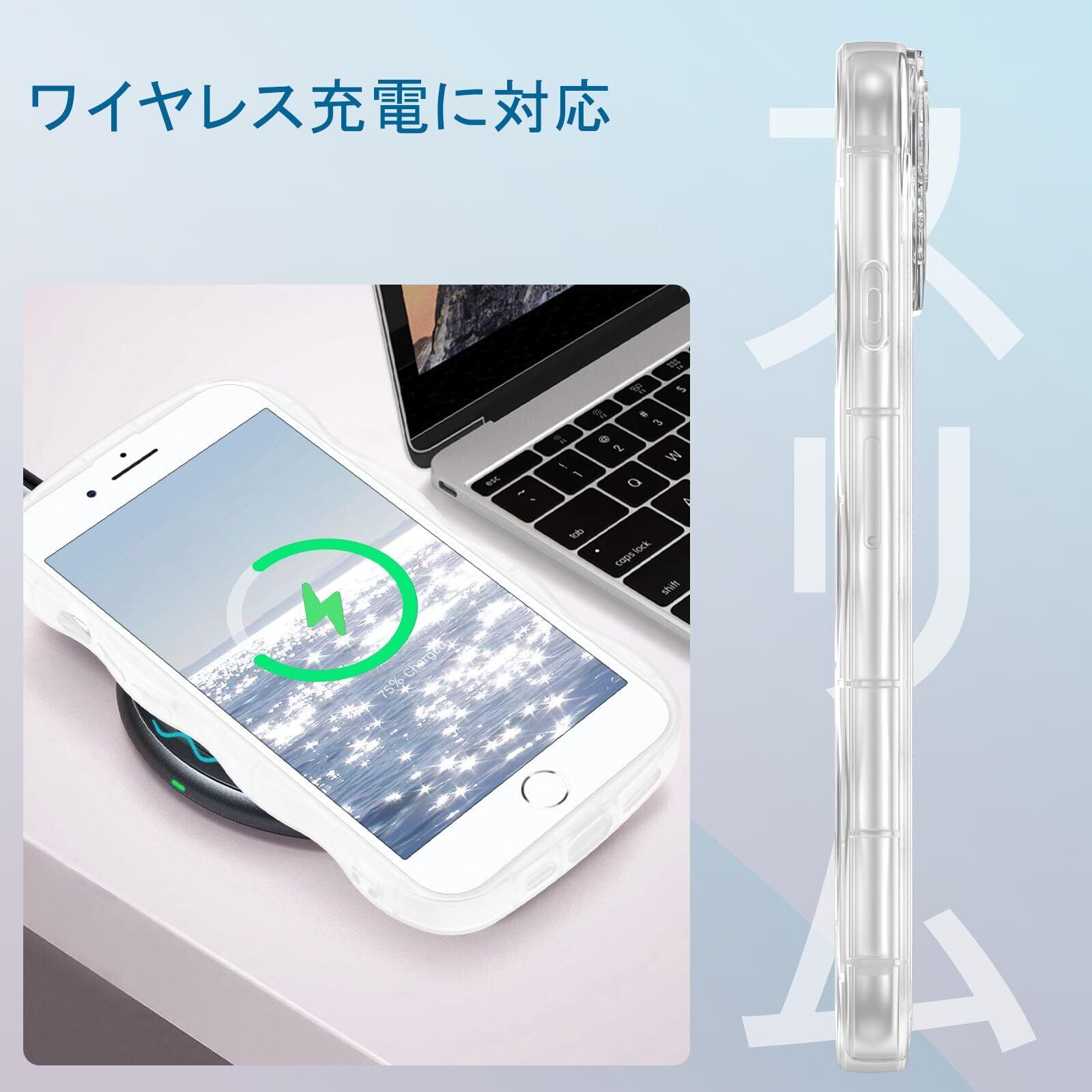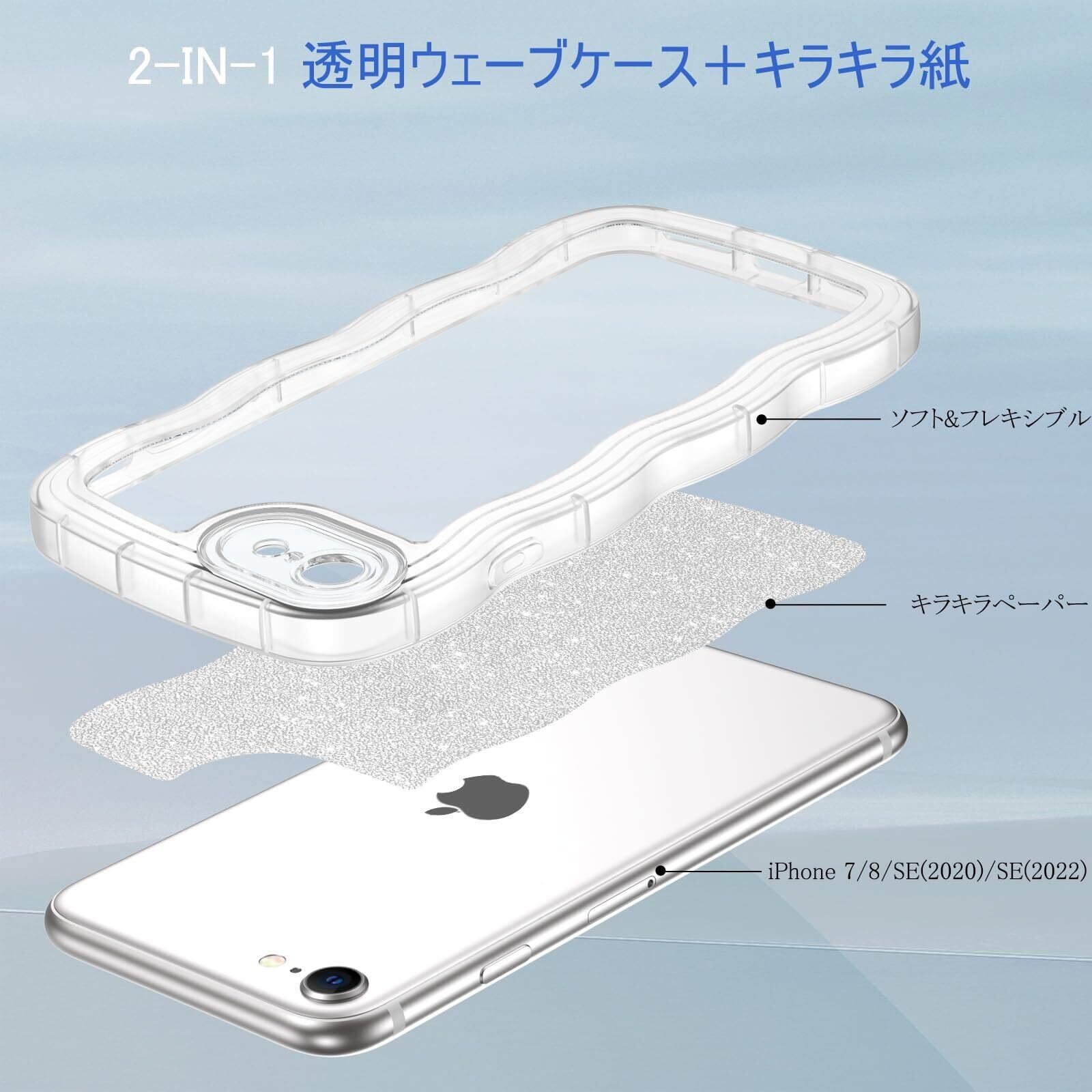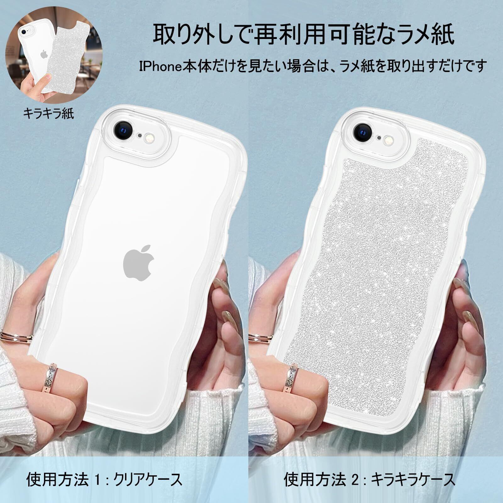 【2-IN-1ウェーブケース+キラキラ紙】2in1デザイン:透明なみなみケース+キラキラ紙。2つの使い方:純粋な透明ケースは電話本体を直接見ることができます。または、キラキラ紙とクリアケース一緒に使用して、携帯電話を輝かせます。自分のスタイルでアイフォンiPhone7/8/SEユニークに飾ります。
