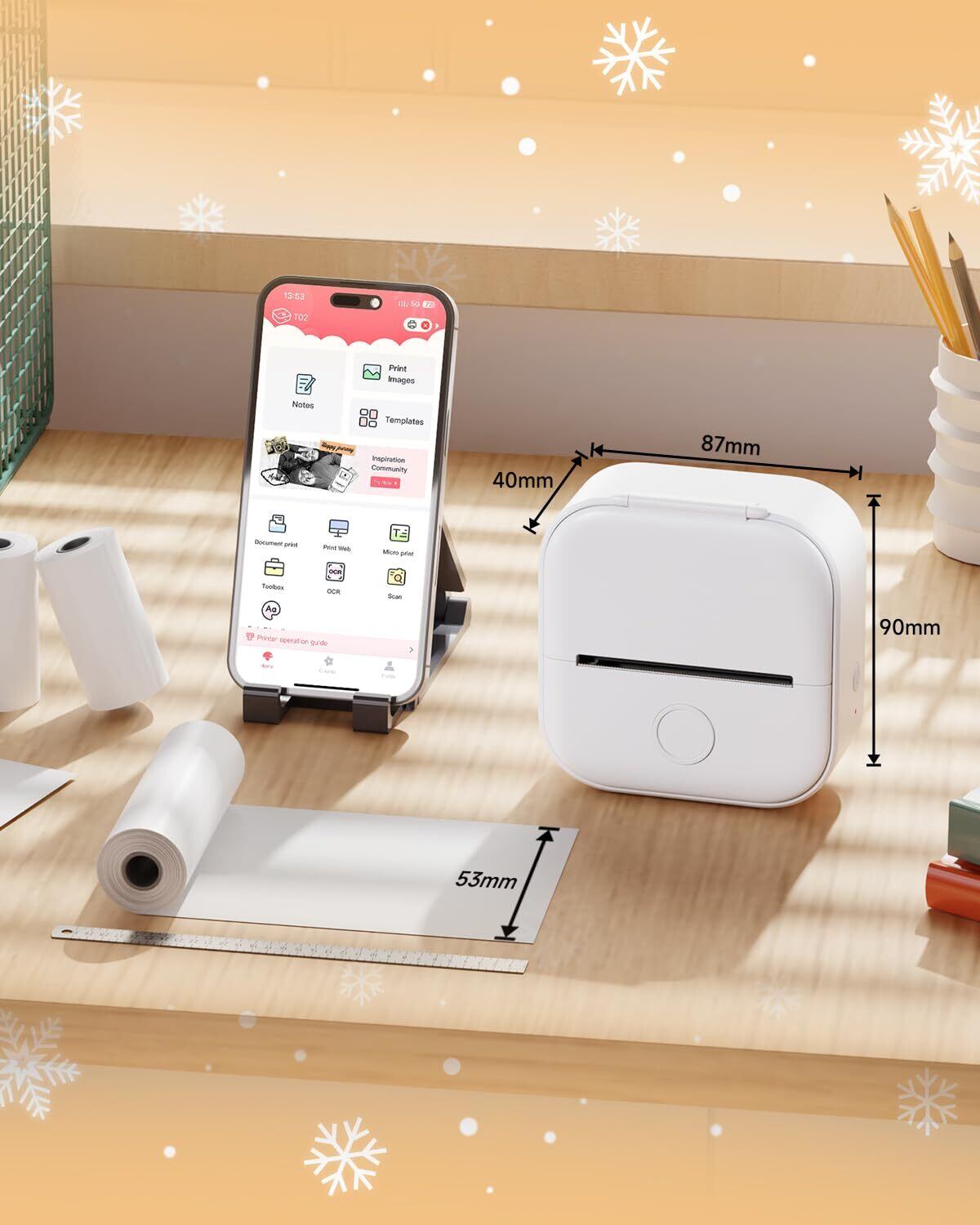 ポータブルミニプリンタ - シンプルでかわいい形、手のひらサイズ、軽量、本格的なポケットプリンター。飛行機などどこでも、テキストや画像を入力するだけで、すぐに印刷することができます、本体にはロール状感熱紙サンプルが付属してい