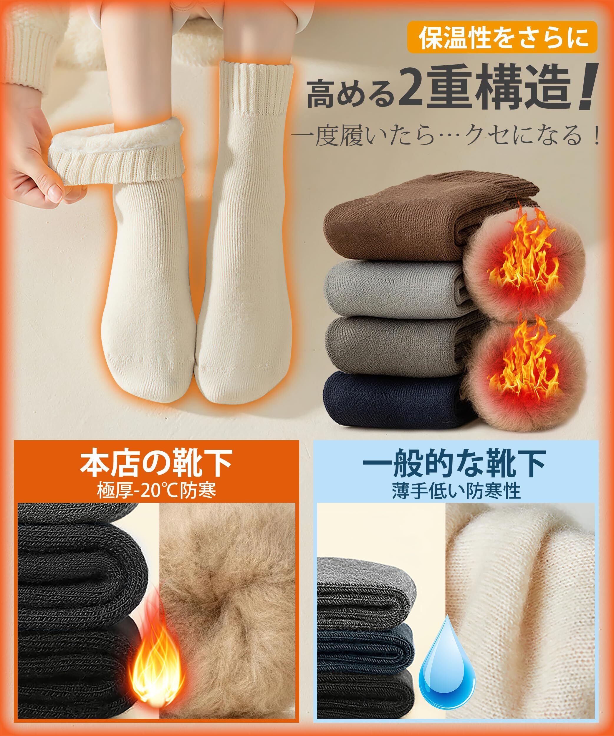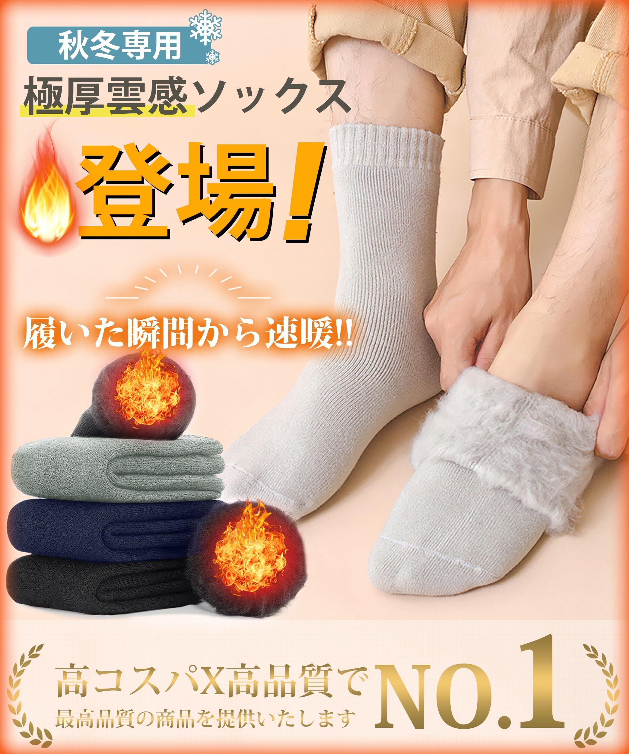 【秋冬専用極厚雲感ソックス登場!】素材構成:60%綿、25%ウール、ポリエステル15% サイズ: 24-29cm 丈の長さ:25cm 表地はコットン素材、裏地はウールでやわらかく非常に暖かい履き心地のルームソックス。足先から足首まで、たっぷり裏起毛に仕上げて、熱を内側に閉じ込め、空気の層ができることで保温力を高くなります。寒い時にアウトドアで長時間暖かいソックスを履けば安心されます。履き口部分は、締めつけ感がなくて、らくらくフィットしてゆったりロゴム設計です。折り返して履いたら、ふわふわの裏起毛が見えて、暖かった同時に可愛らしくコーディネートが出来まして、本当に着け心地が良し、今年の冬にも大活躍です!