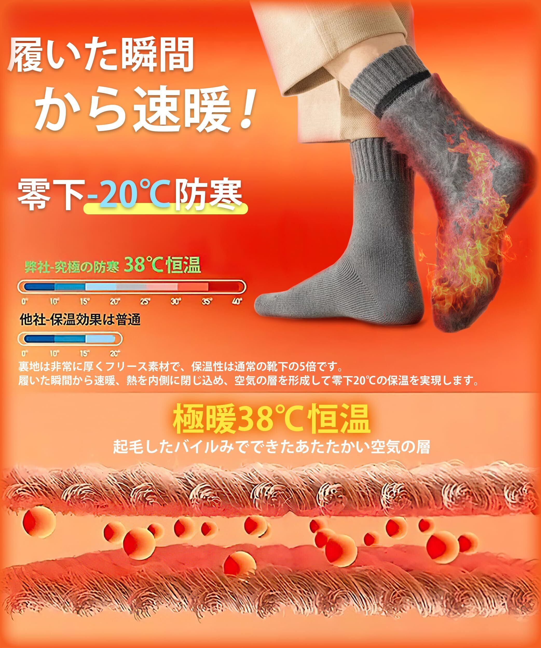 靴下 メンズ ソックス 冬 【履いた瞬間から速暖・抗寒力max】【極厚雲感裏パイル・極暖38℃恒温】 ウールソックス 防寒靴下 360°蓄熱 冷え性対策 厚手 防寒 保温 消臭 耐久性 伸縮性 室内 アウトドア 登山 キャンプ 25-29㎝ 3足-5足セット