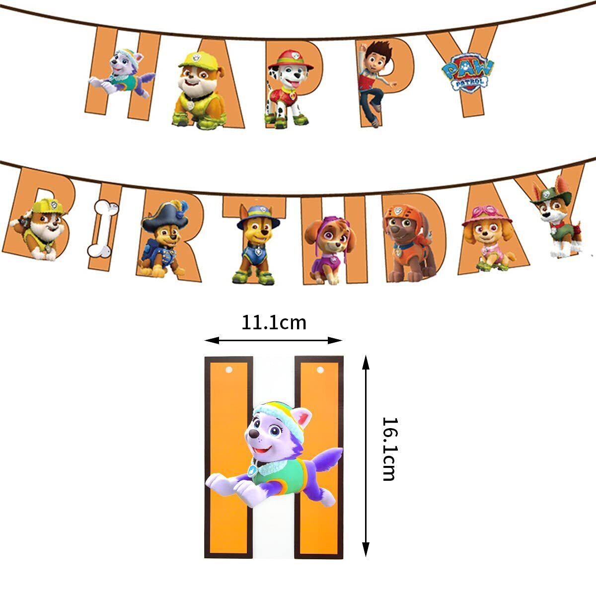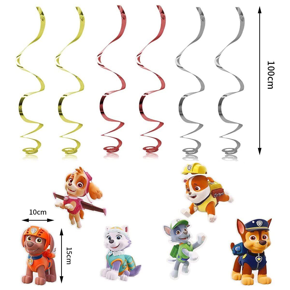 【セット内容物】:happy birthdayガーランド1点、アルミバルーン1点、ケーキトッパー1点、吊り飾り6点、 合計10点のパウパトロール誕生日飾り付けセット。(螺旋風船リボン付き)
