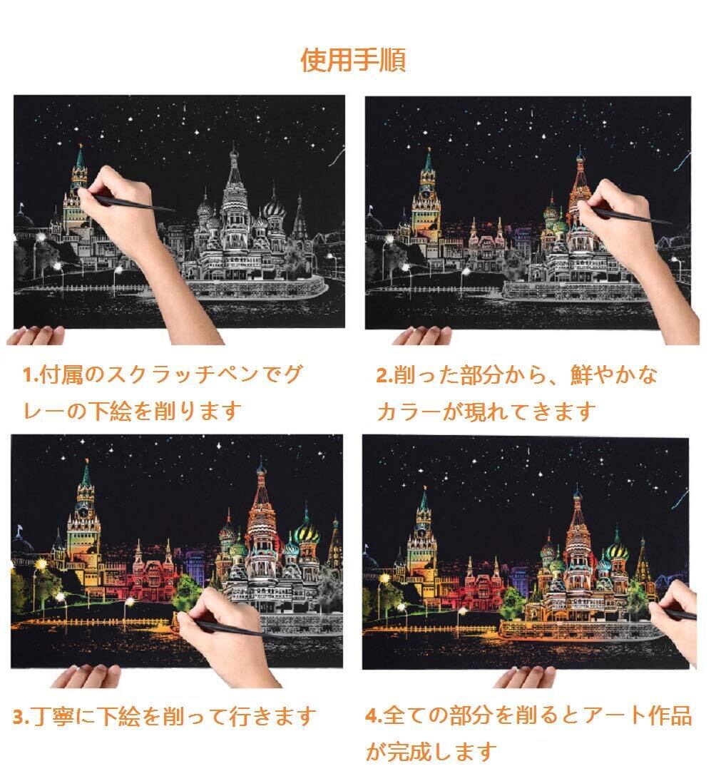 【使用方法】:1.付属のスクラッチペンでグレーの下絵を削ります。2.削った部分から、鮮やかなカラーが現れてきます。3.丁寧に下絵を削って行きます。4.全ての部分を削るとアート作品が完成。