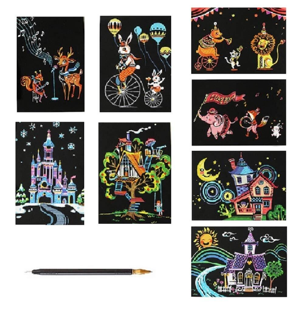 OKUSU-JP 8枚セット スクラッチアート カラフラ ペーパーアート 削るだけで美しいアート 夢のようなお城 かわいい 動物 面白い 塗り絵 スクラッチ極細ペン1本 子供 動物とお城